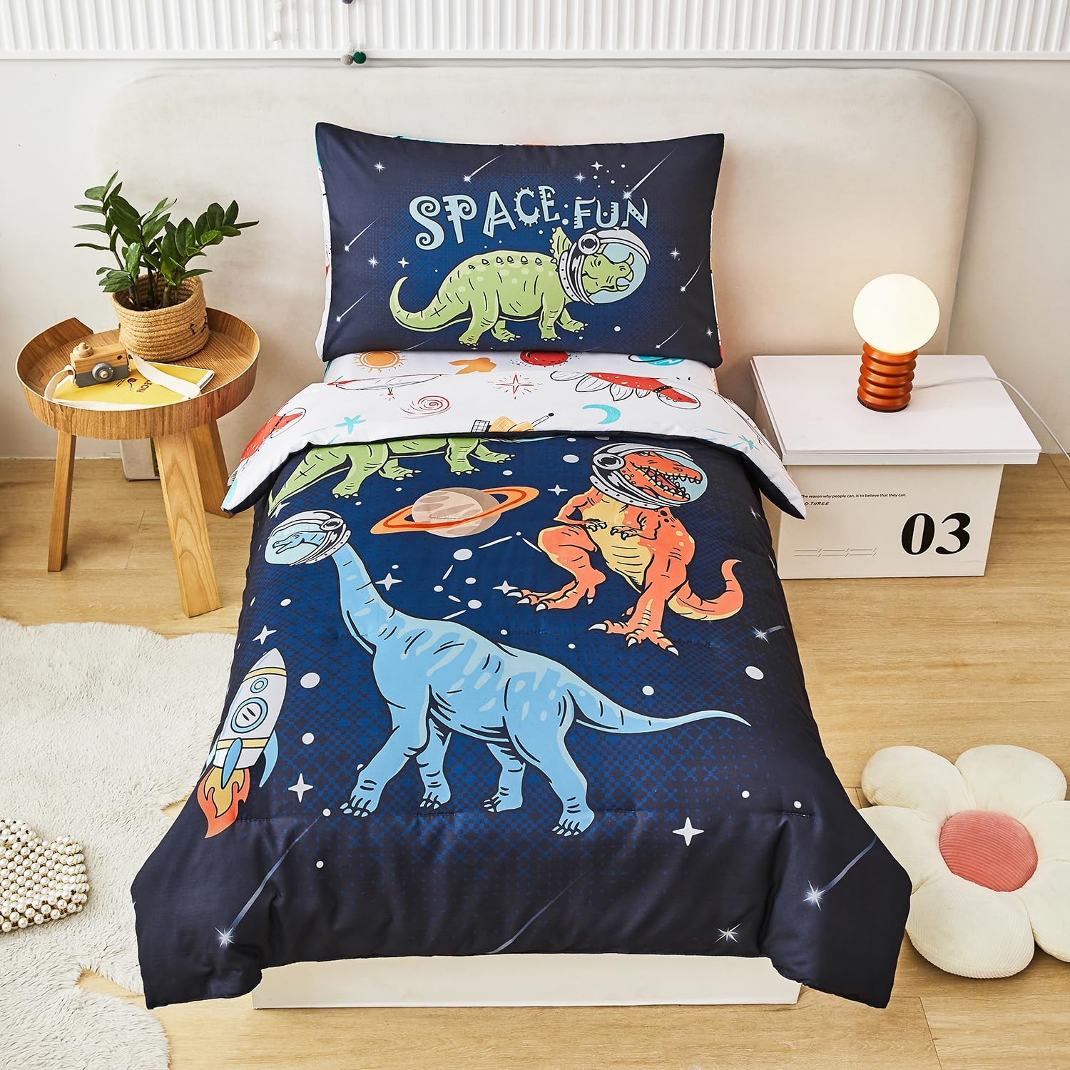4 PCS Toddler Bedding Set for Boys Space Dinosaur Printed Toddler Comforter S...