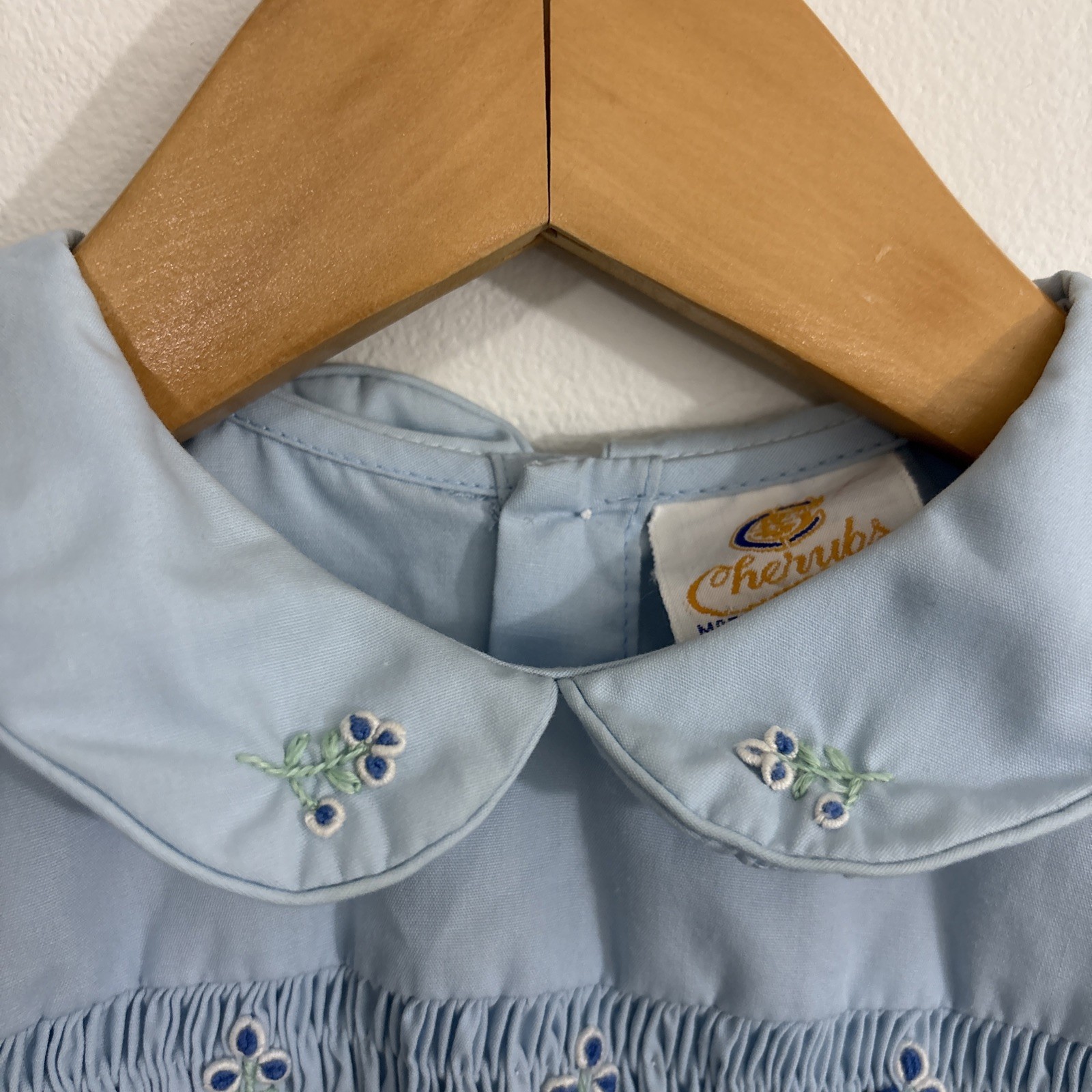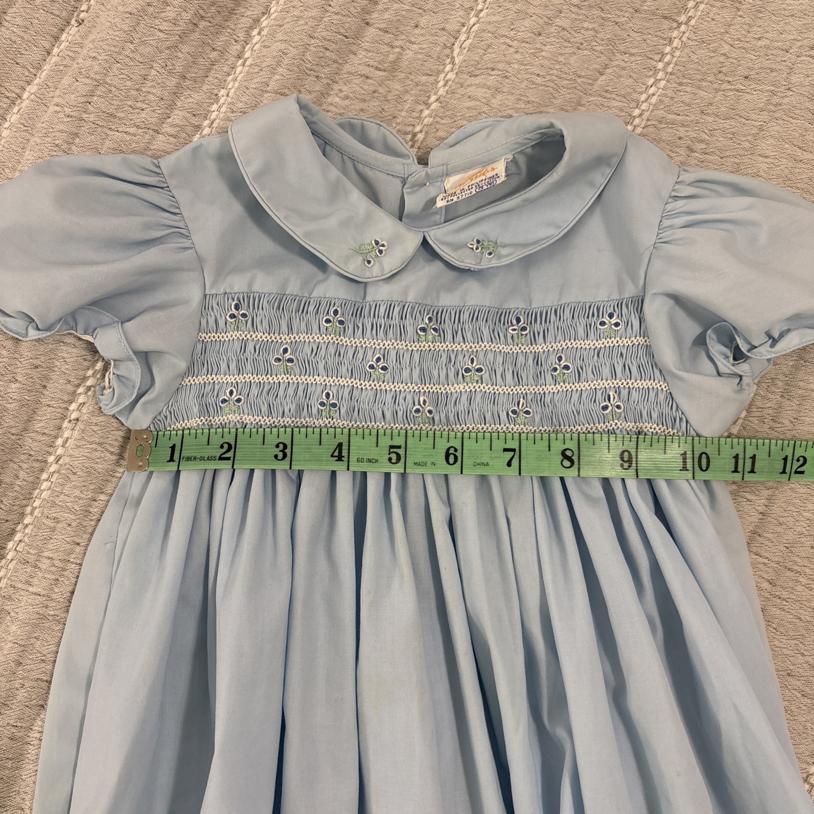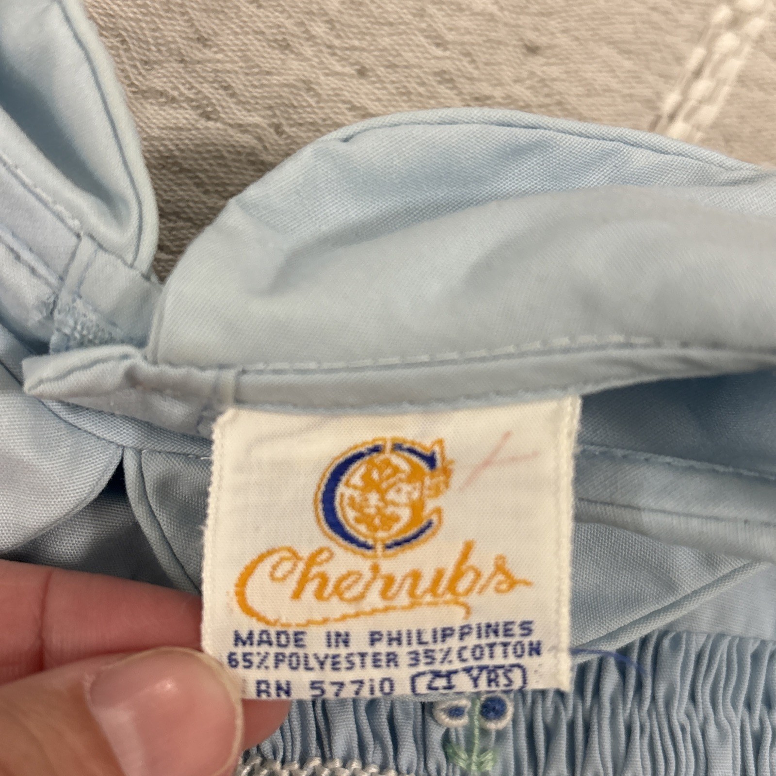 Vtg Cherubs Blue Smocked Toddler Girl Dress Embroidered Flower Buds Size 2t