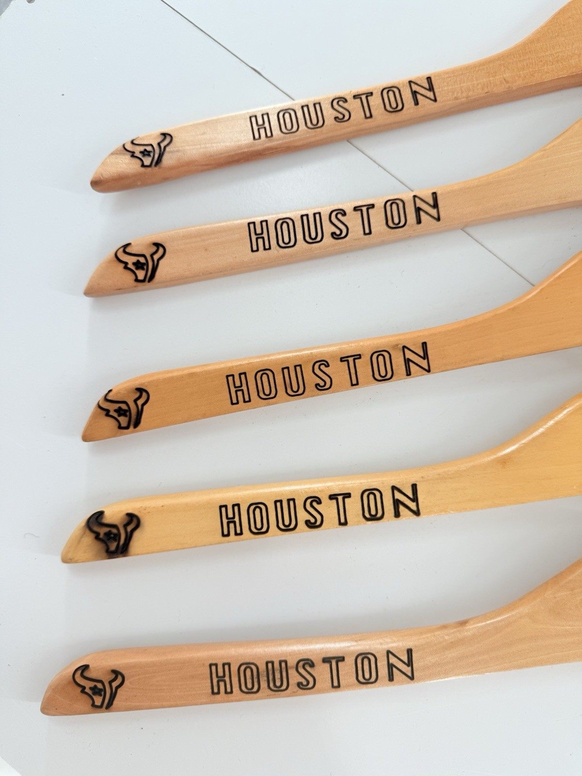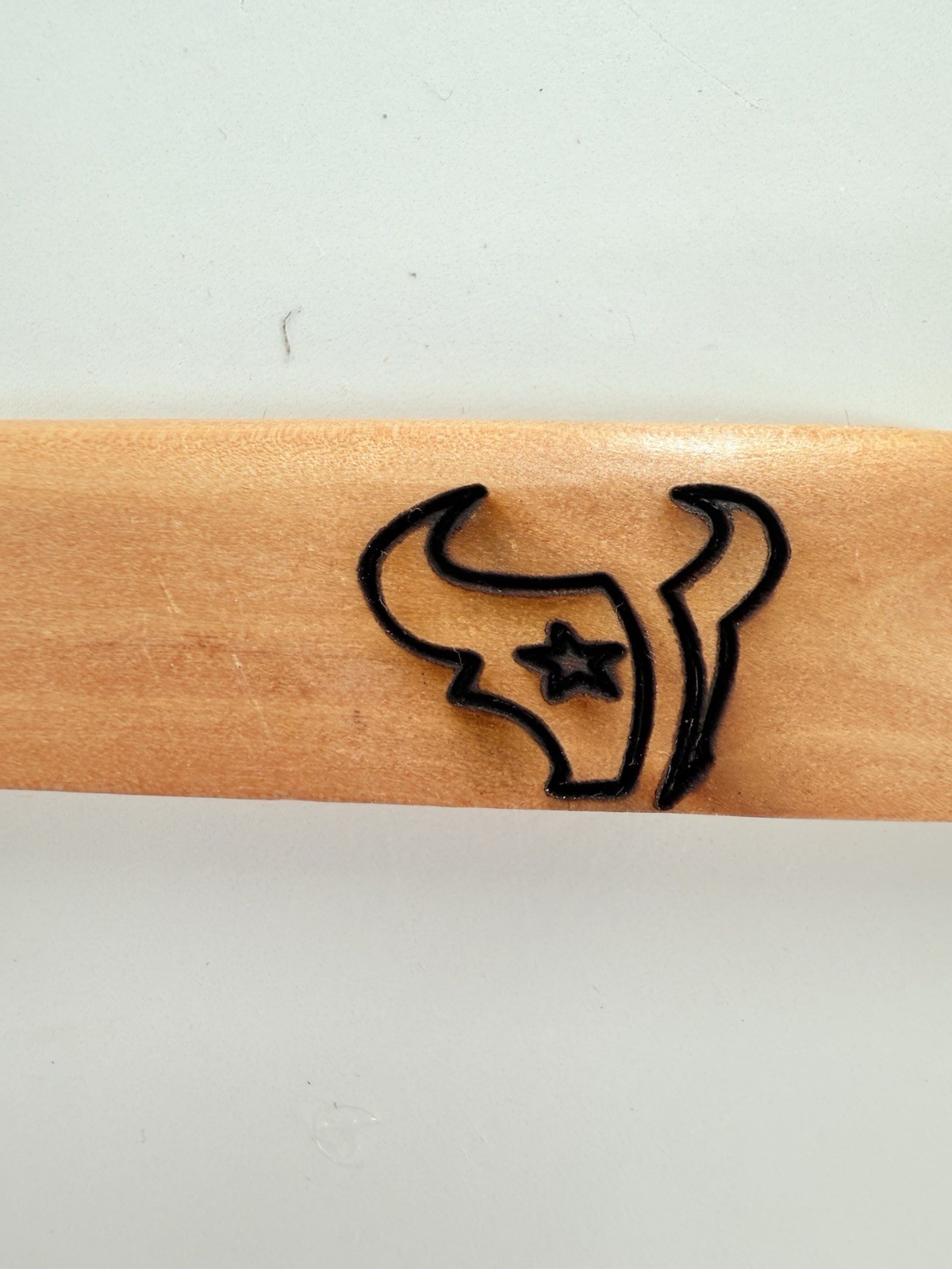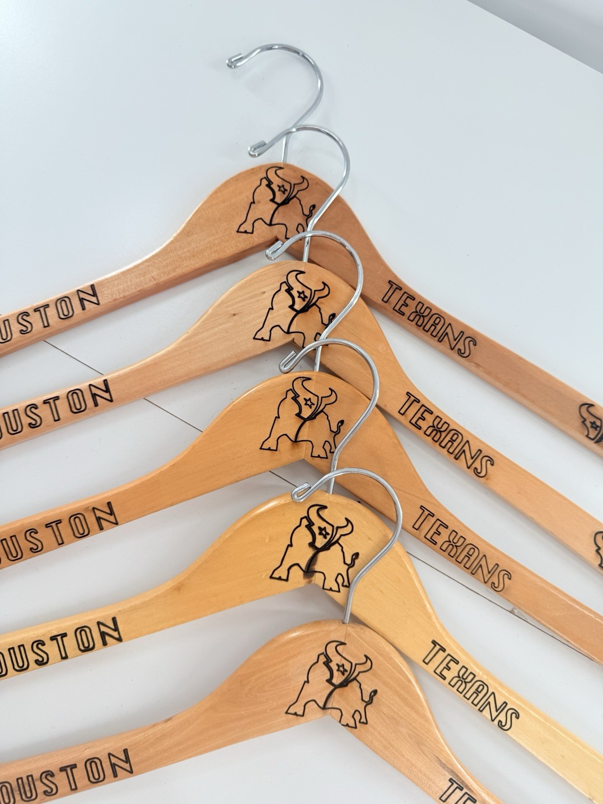 5 Custom personalized wooden hangers featuring the Houston Texans logo and name