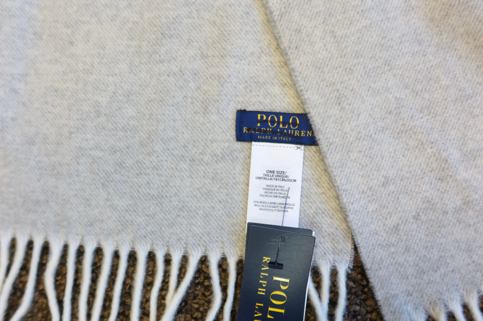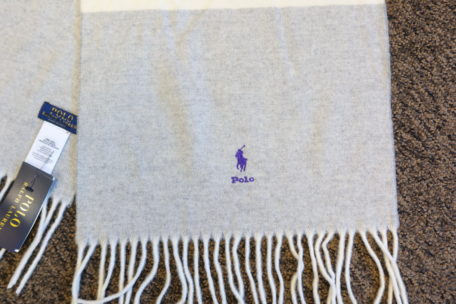 78 New Polo Ralph Lauren Wool Two-Tone Scarf - Gray / Cream with Purple Logo