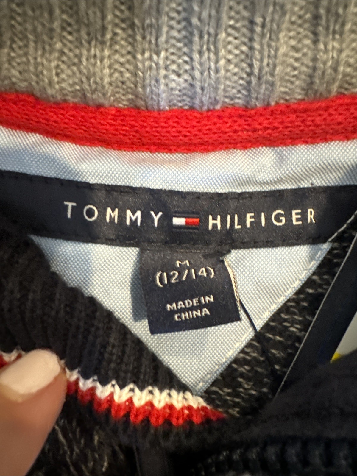 как выглядит Tommy Hilfiger Boys M 12/14 Quarter Zip Sweater Navy Gray Stripe NWT Cotton фото