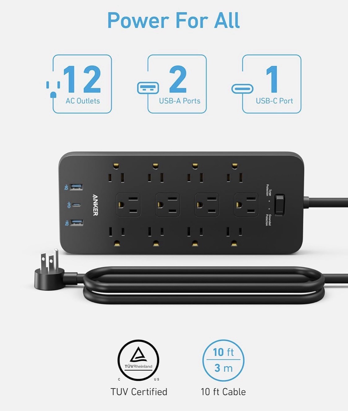 ANKER Power Strip Surge Protector 2100J , 12 Outlets with 2 USB A and 1 USB CP
