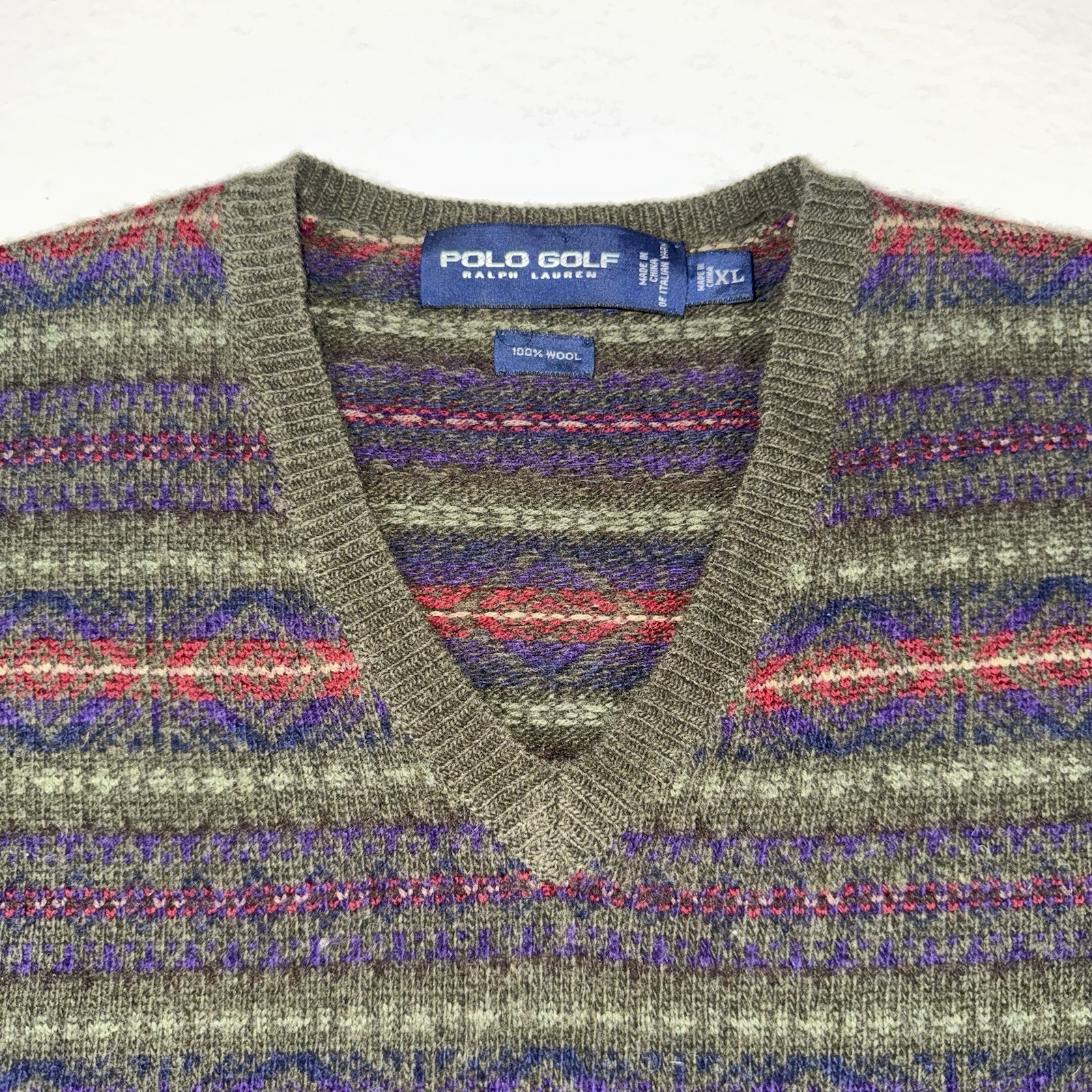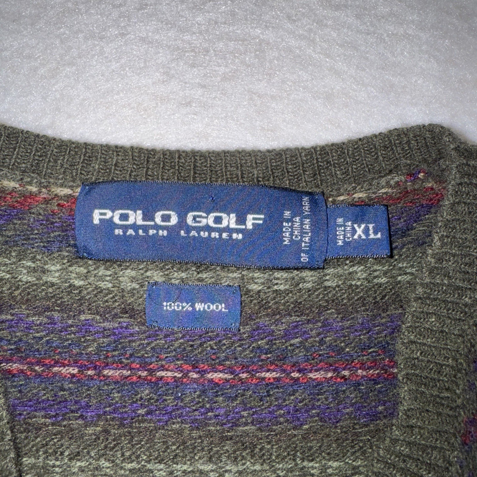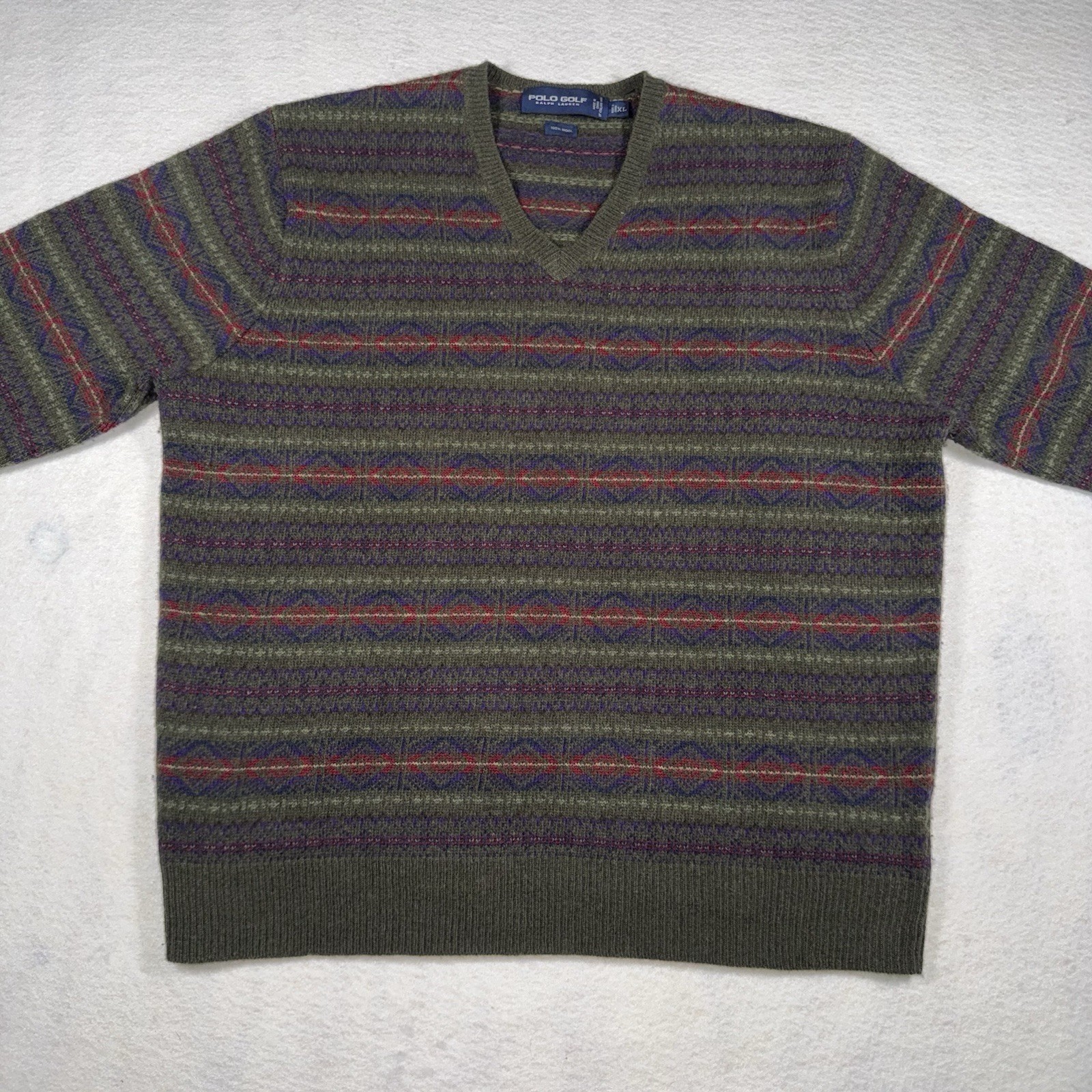 Vintage Polo Ralph Lauren Fair Isle Sweater Size XL Olive Wool V Neck Preppy
