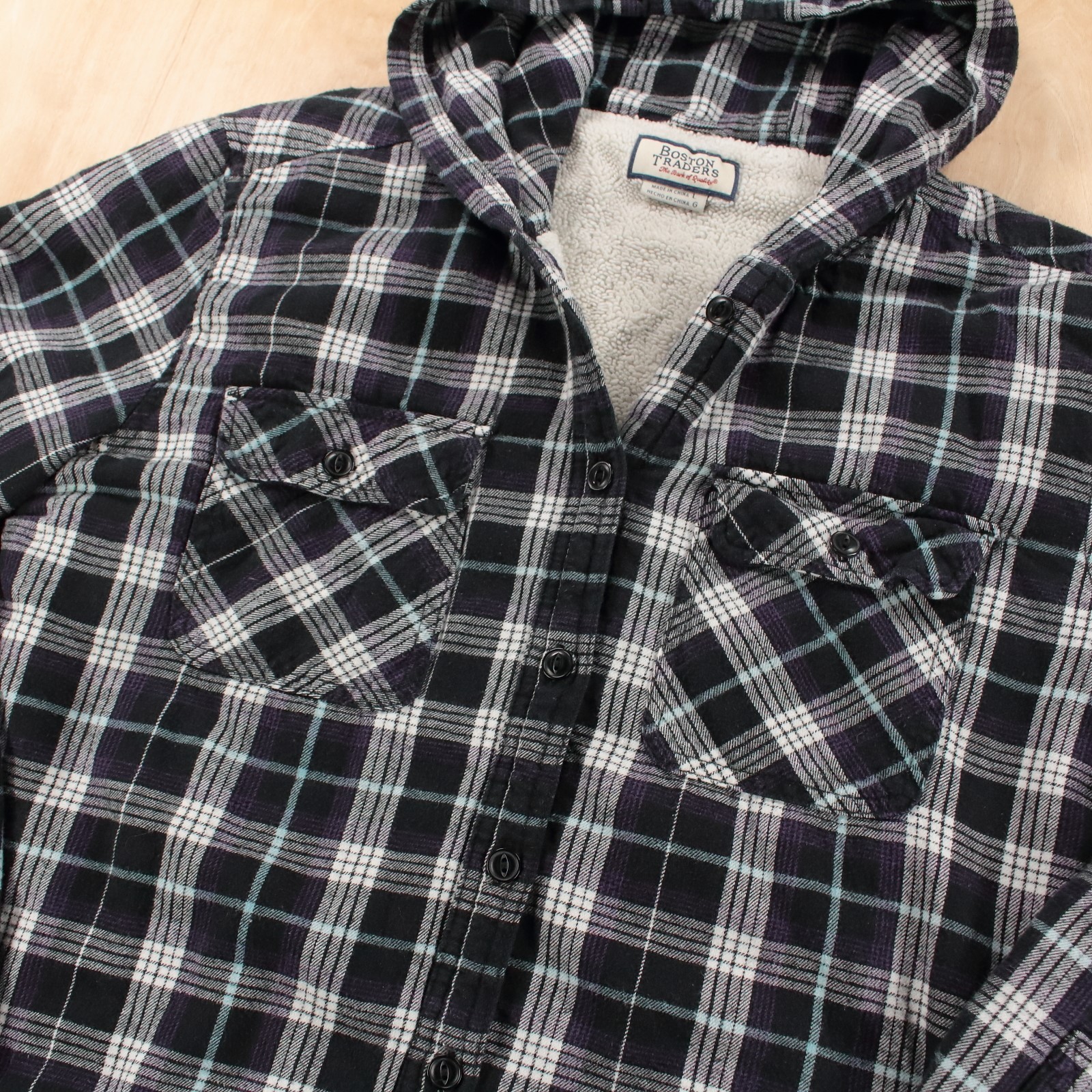 BOSTON TRADERS women's sherpa lined hooded plaid flannel shirt jacket LARGE