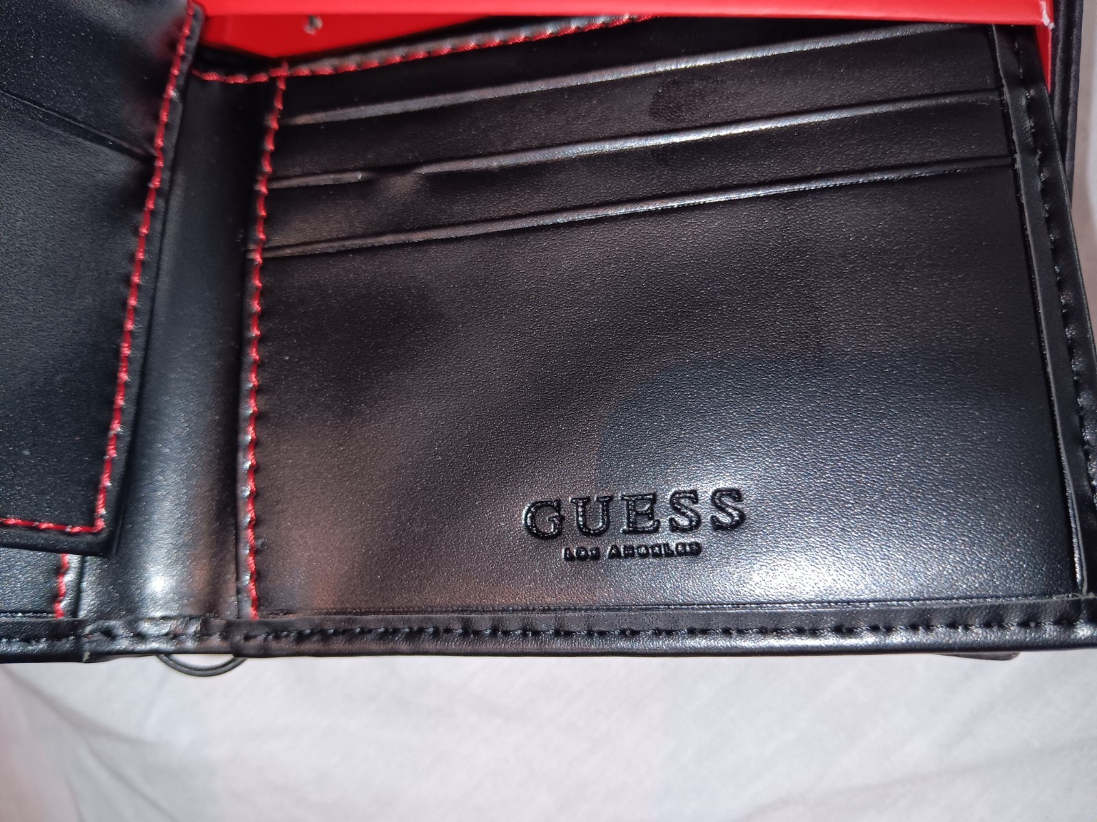 GUESS LOGO MEN BLACK LEATHER WITH RED STITCHING BILLFOLD PHOTO ID WALLET 48 NIB