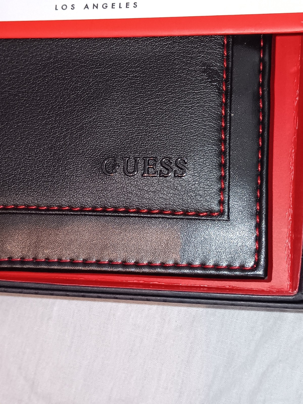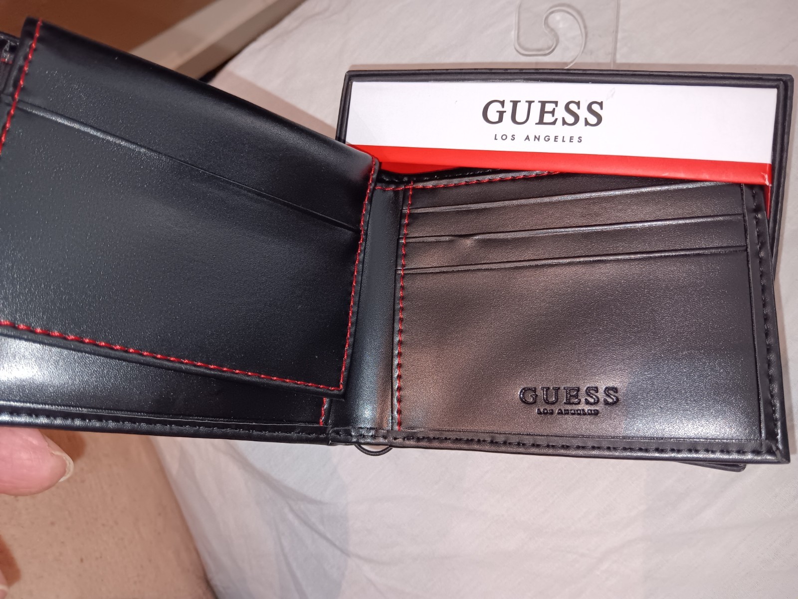 как выглядит GUESS LOGO MEN BLACK LEATHER WITH RED STITCHING BILLFOLD PHOTO ID WALLET 48 NIB фото