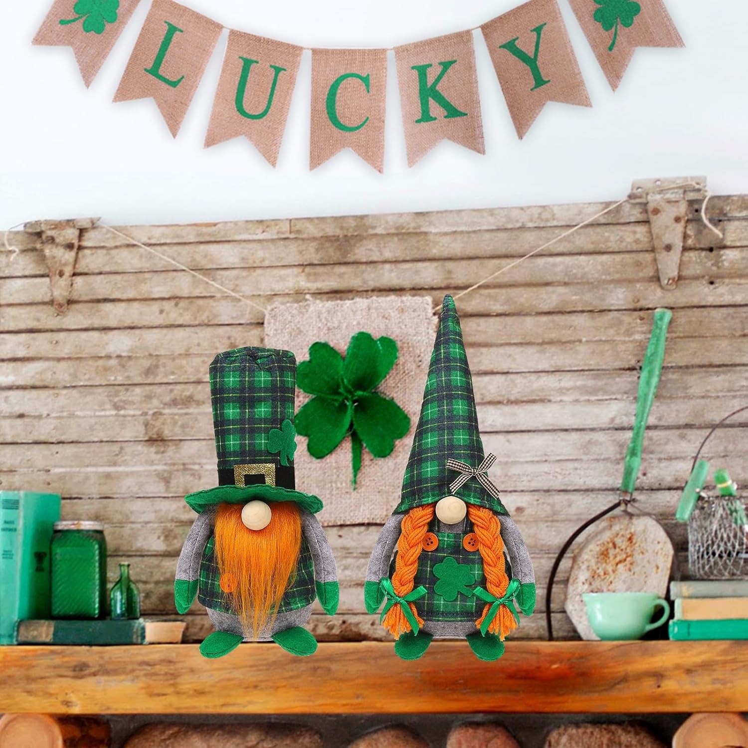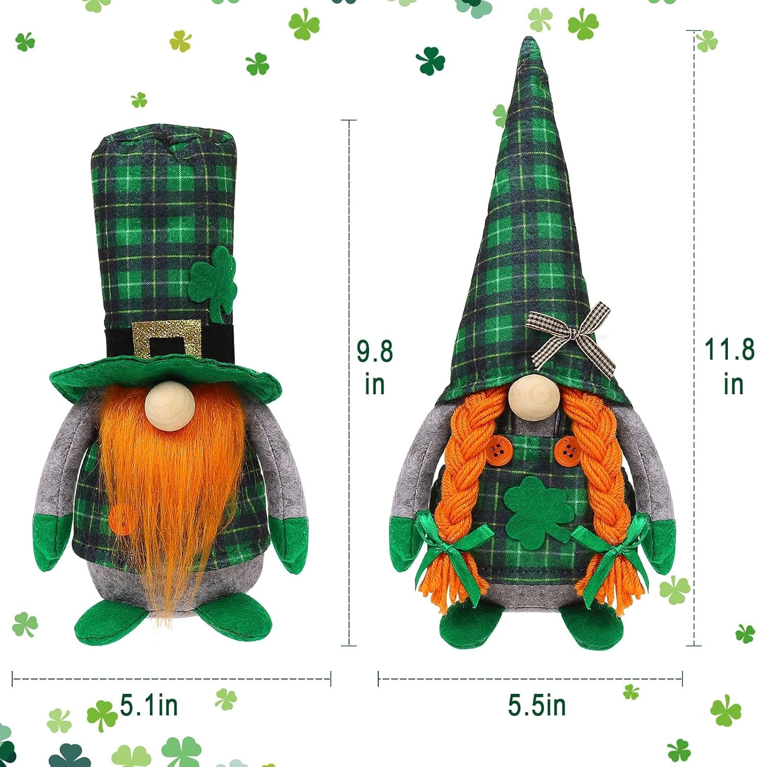 St Patrick's Day Gnomes Plush Decoration, 2 Pack different Green Grid Hats with