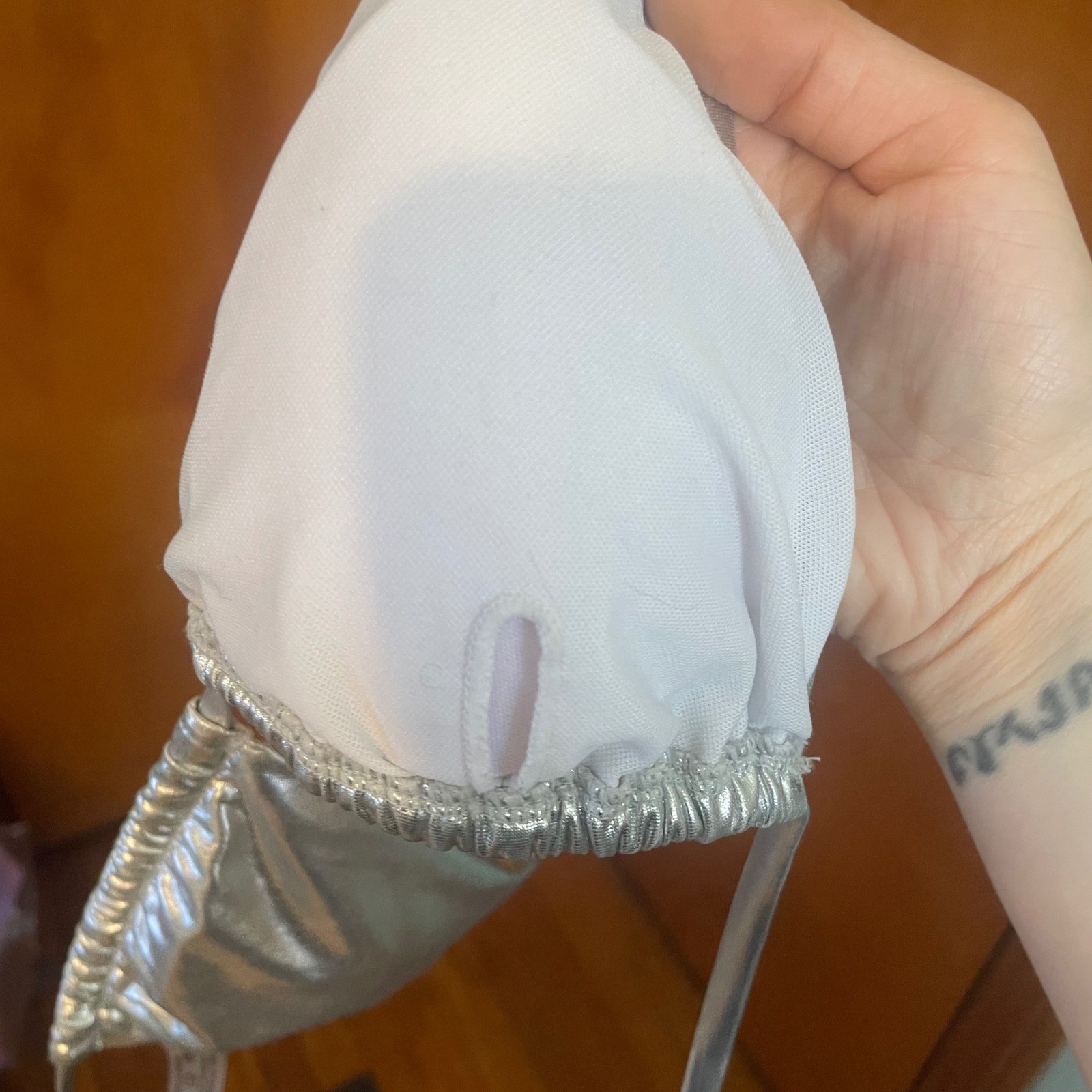 как выглядит Metallic Silver Halter Bikini Top Triangle Cups Ties Adjustable Small S фото
