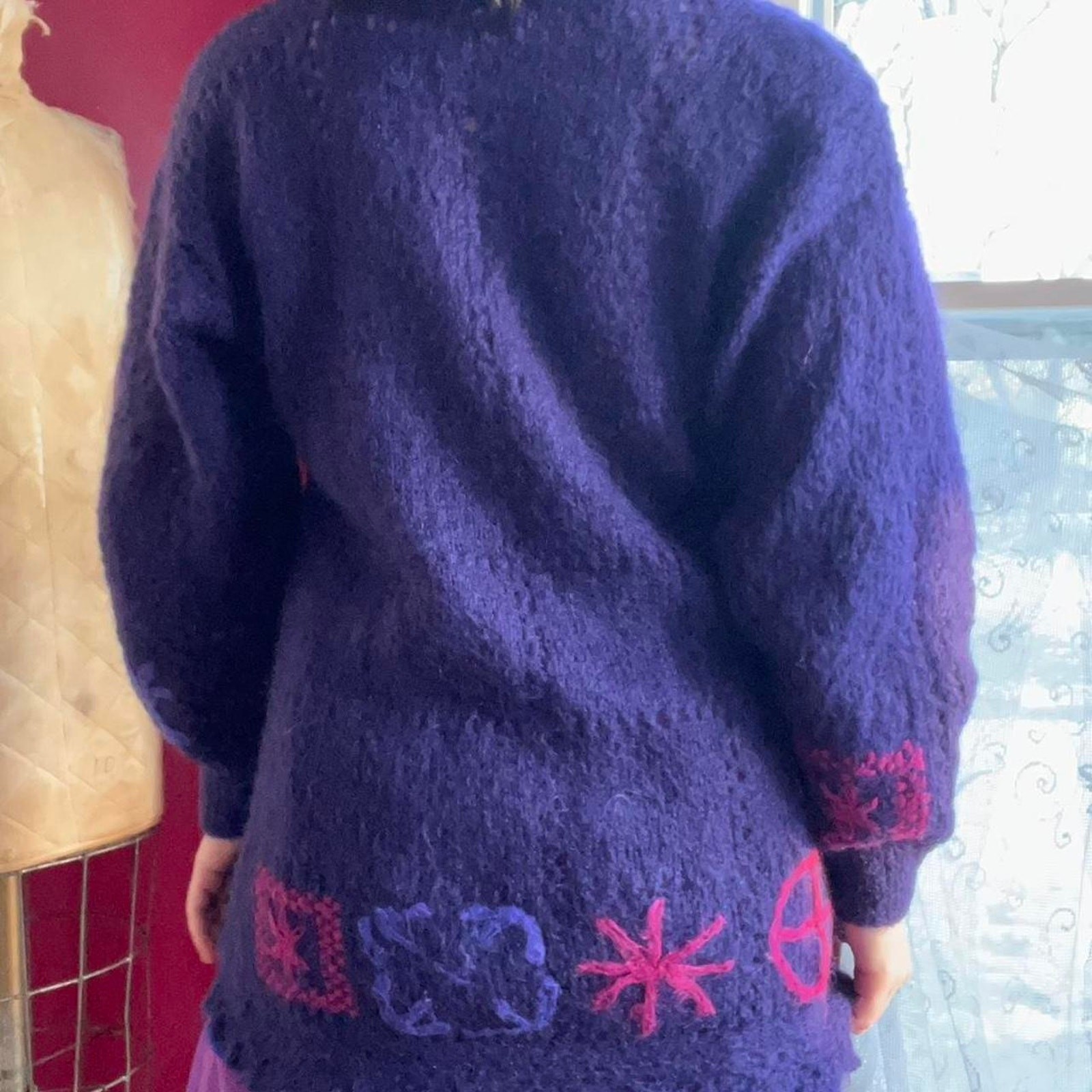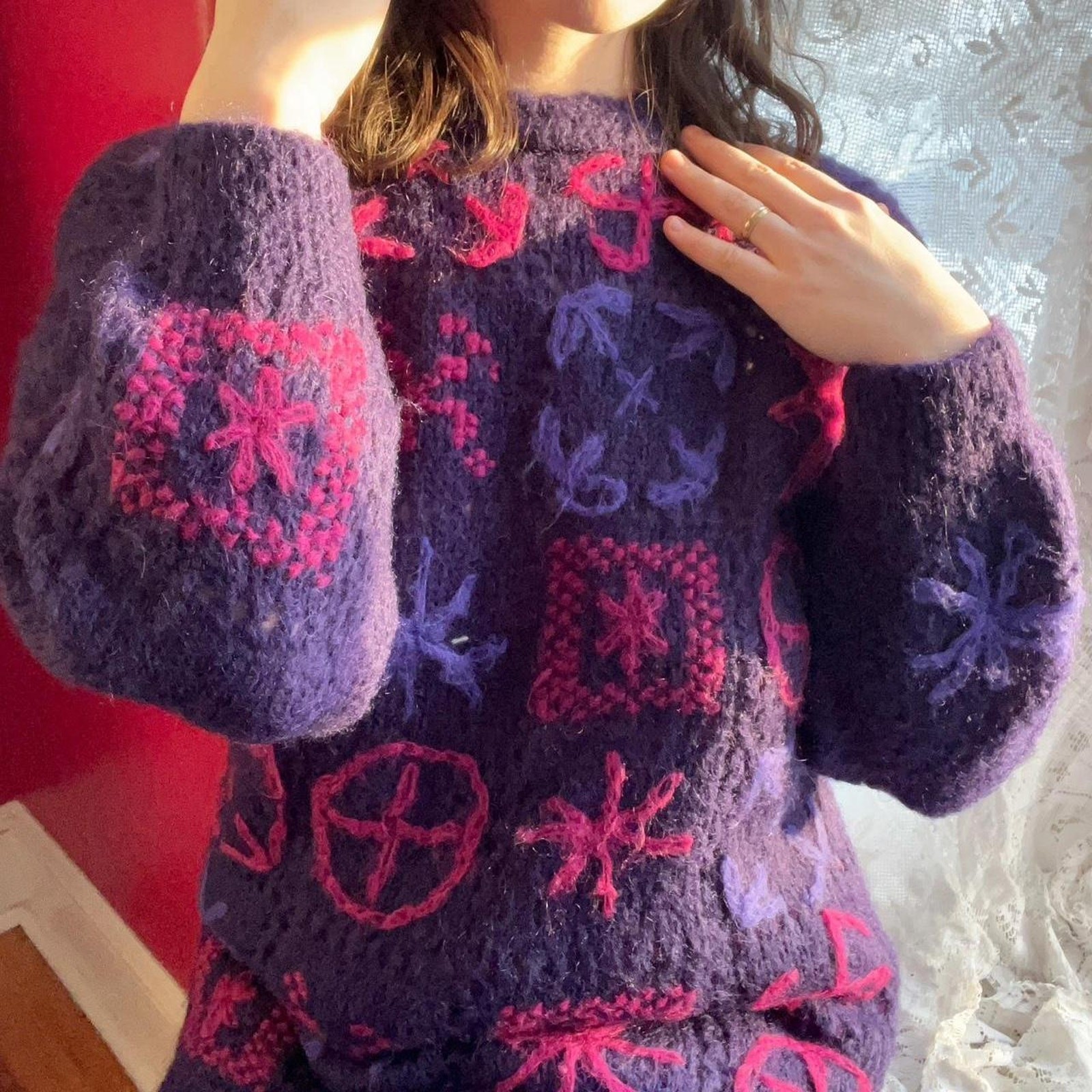 как выглядит Vintage 1980s 1990s Purple Mohair Wool Mix Hand Knitted Symbols Jumper Sweater S фото