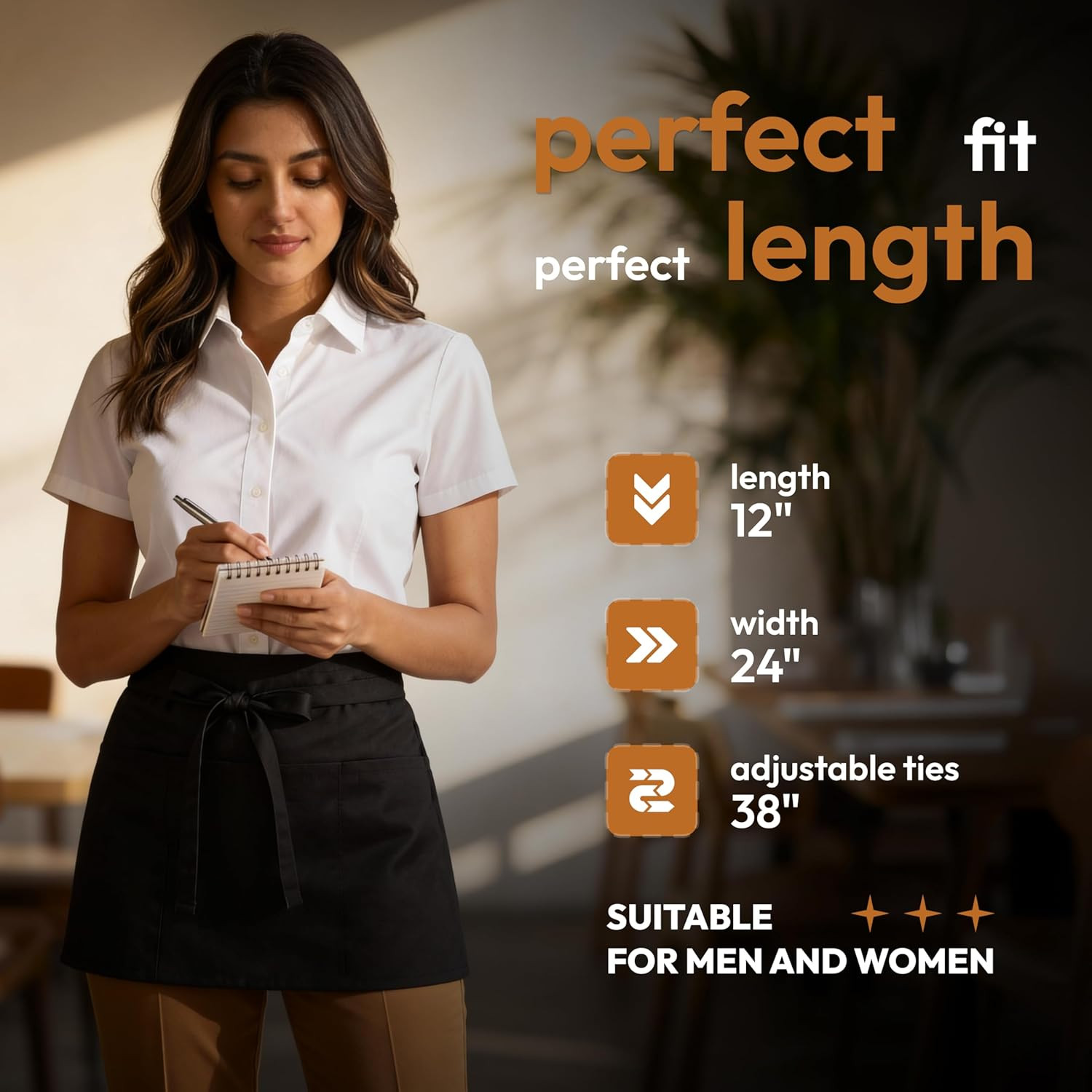 12 Pack - Black Server Waist Aprons with 3 Pockets, Waitress Half Apron