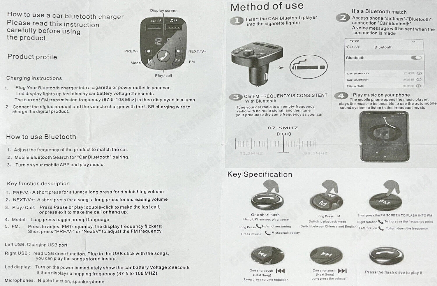 Особенности: MP3 Player, Wireless, Radio Receiver, Dual USB Port Charger, Mp3 Audio Music Stereo Adapter, Play Music in Multi Way, Support Power & Memory Function, Support charge while listening to songs, The screen can show the frequency, Support Bluetooth/USB Disk Player, Noise Cancellation, Build in Microphone, Bluetooth Wireless, Charging Capability, Hands Free Calling, LCD Screen