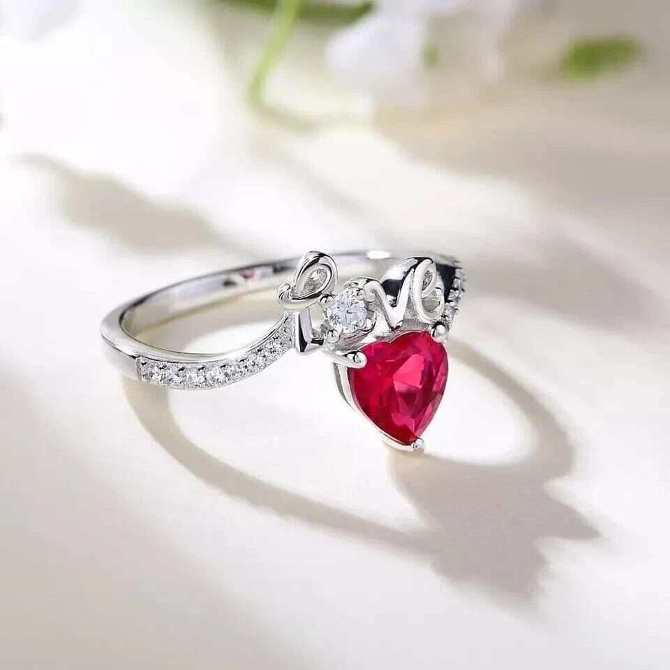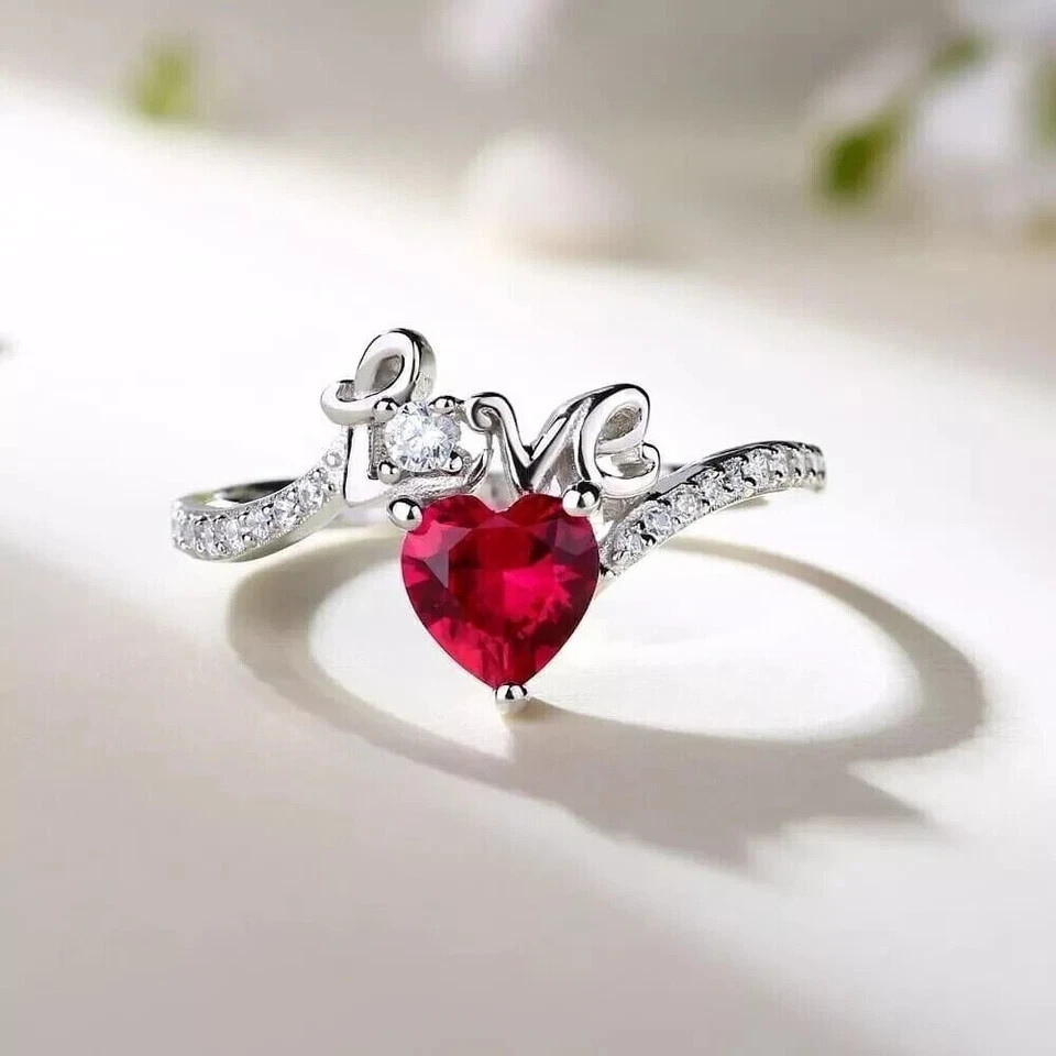 2.10Ct Heart Cut Simulated Ruby Valentine Heat Love Ring 14k White Gold Plated