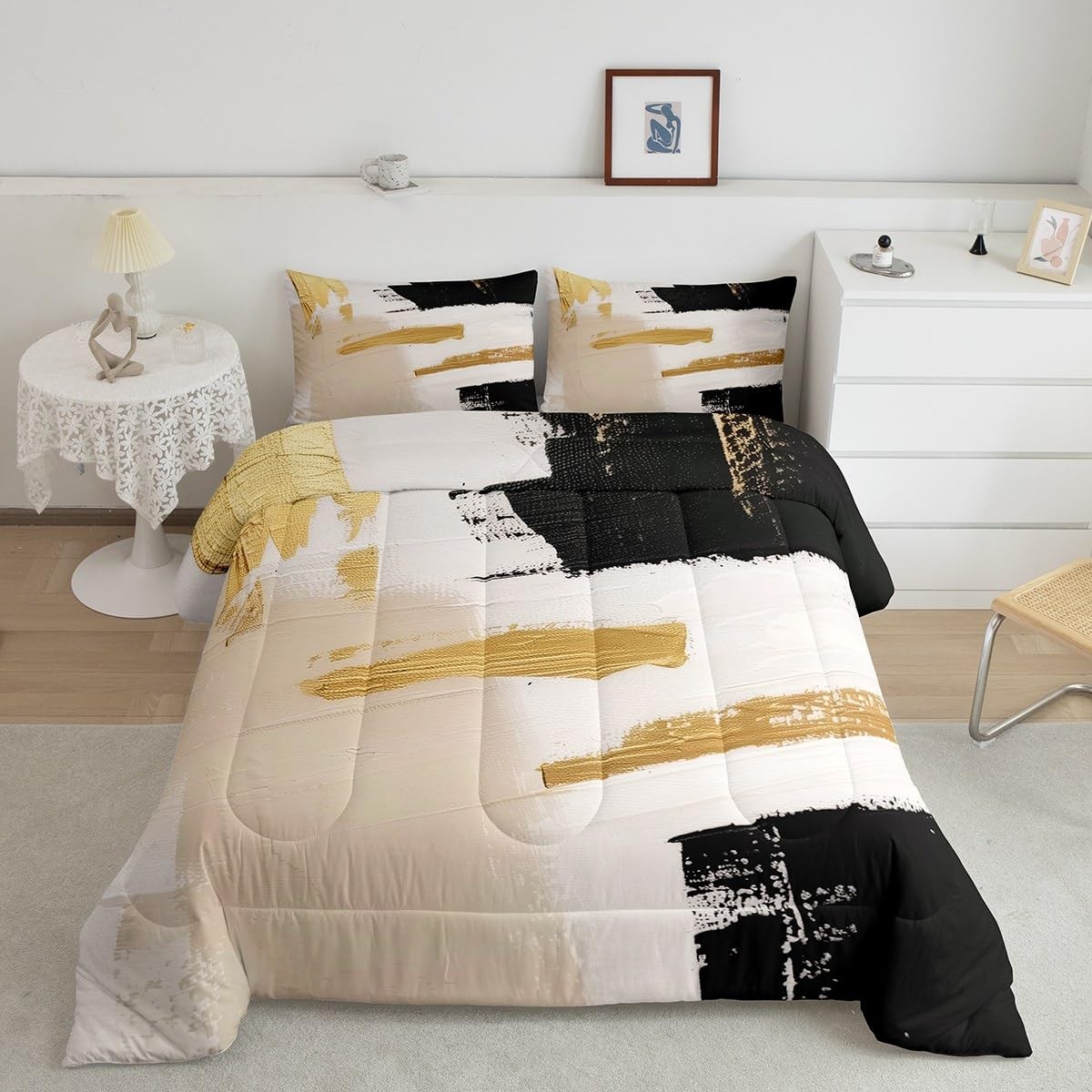 Abstract Art Duvet Quilt Black Gold Bedding Set for Boys Girls Teens Room Dec...