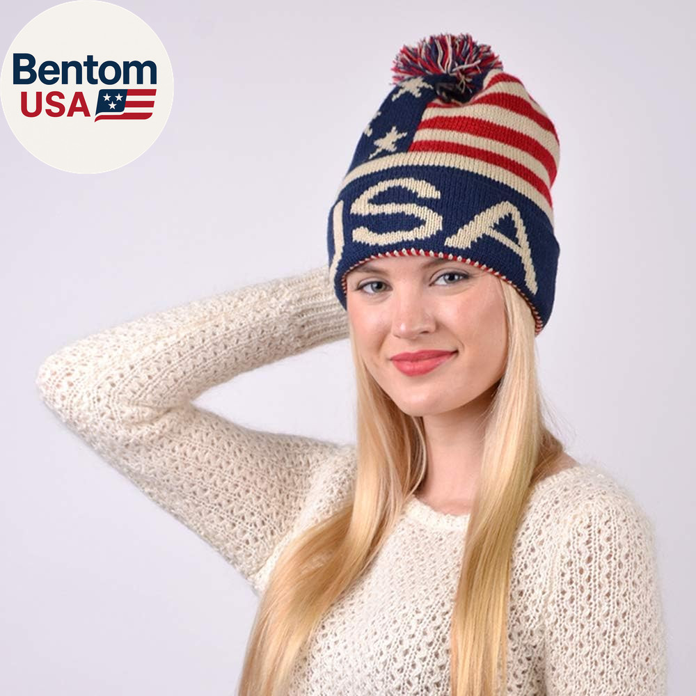USA Winter Hat - Knit, Cuffed Beanie with Pom Pom, USA Flag Design, Warm Fun for
