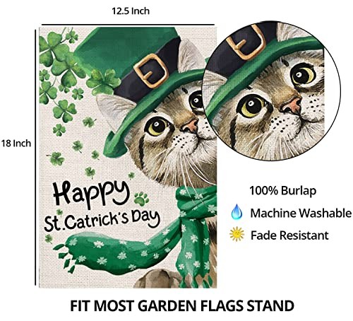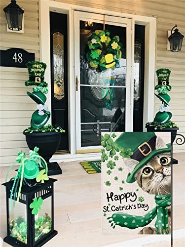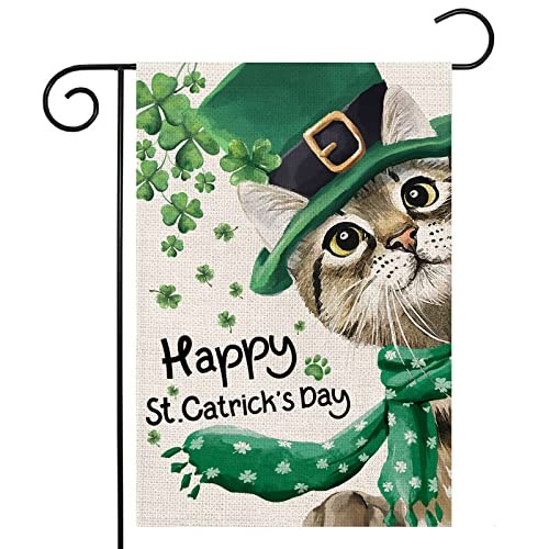 Happy St Patricks Day Garden Flag for Outdoor,Cat with Hat Scarf Shamrock Green