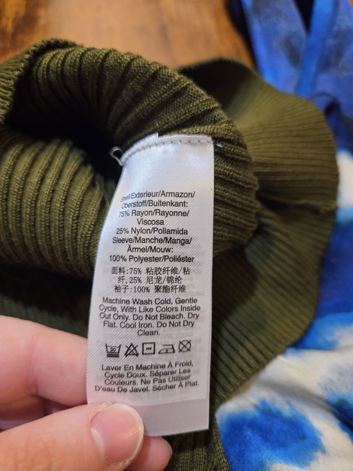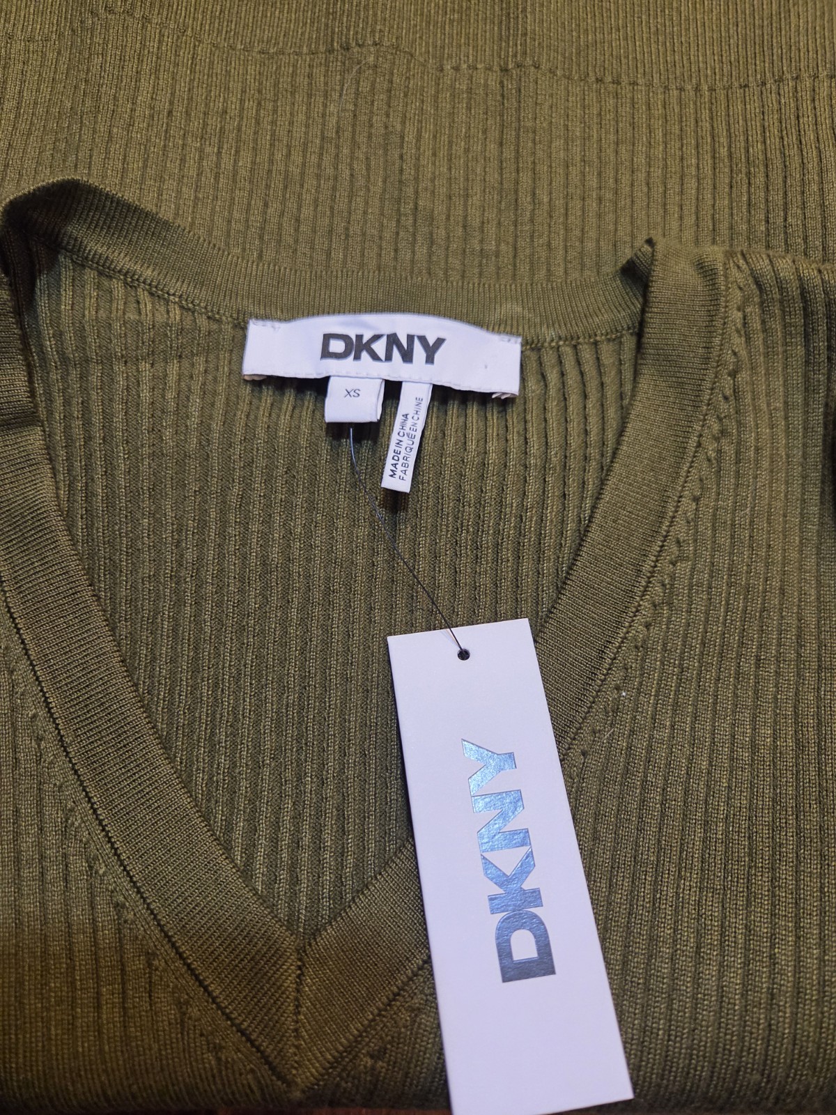 как выглядит NWT DKNY Dark olive green sweater with ink swirl pattern sleeves Size XS фото