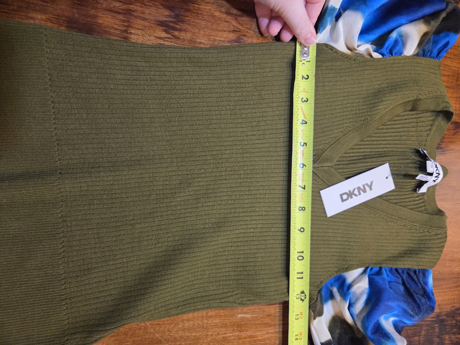 NWT DKNY Dark olive green sweater with ink swirl pattern sleeves Size XS