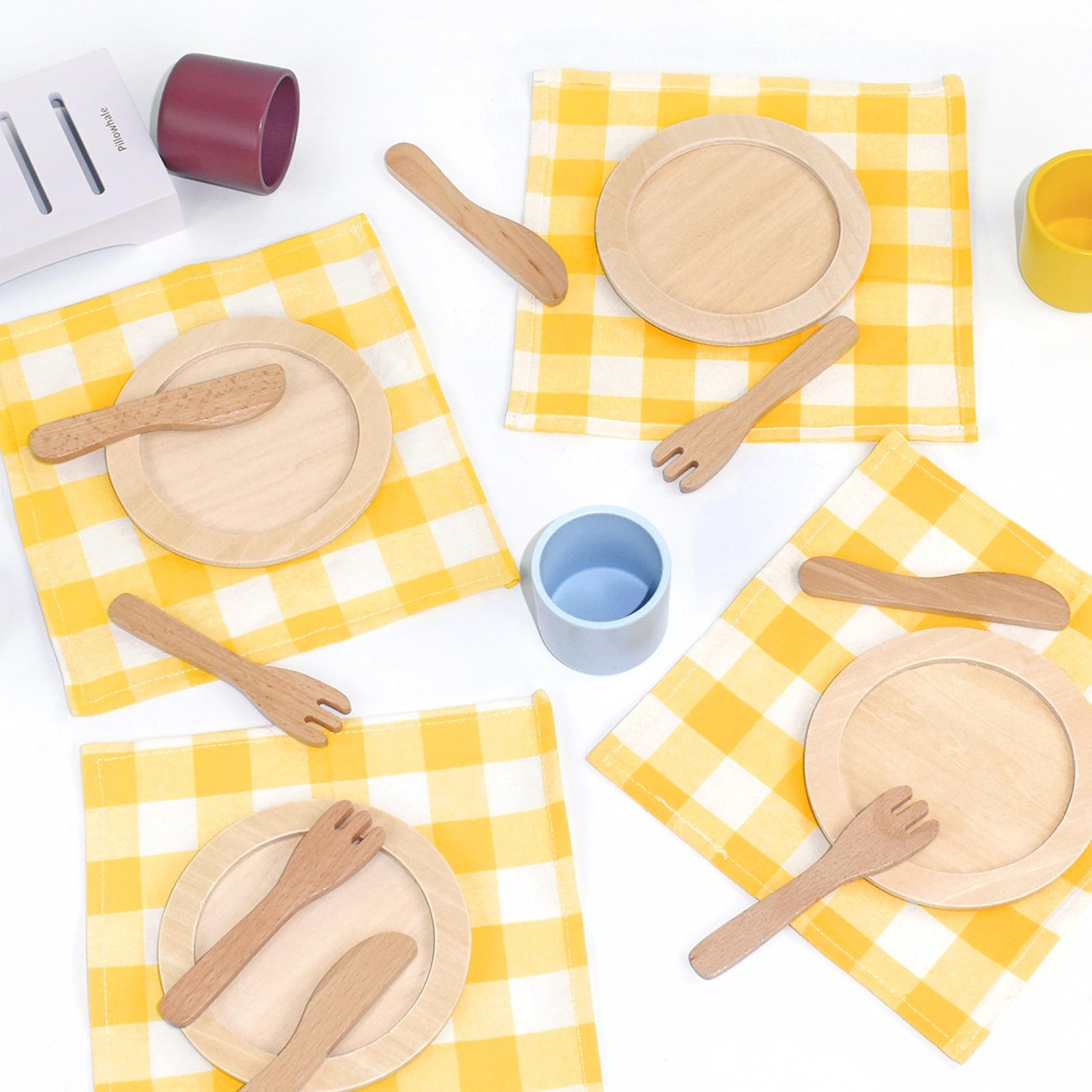 как выглядит Wooden Toy Plates and Dishes Set,Play Kitchen Cutlery and Plate Set,21Piece K... фото