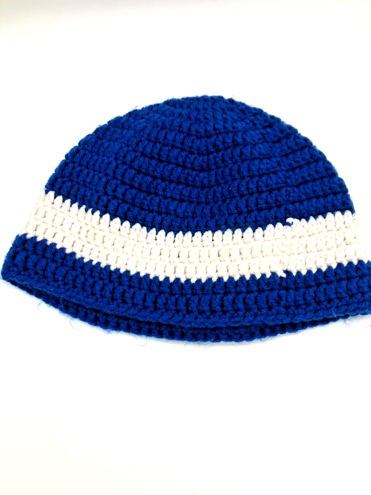 как выглядит 2 Handmade Knitted Colorado Flag Colored Beanie Hats Pom Blue White Red Yellow фото