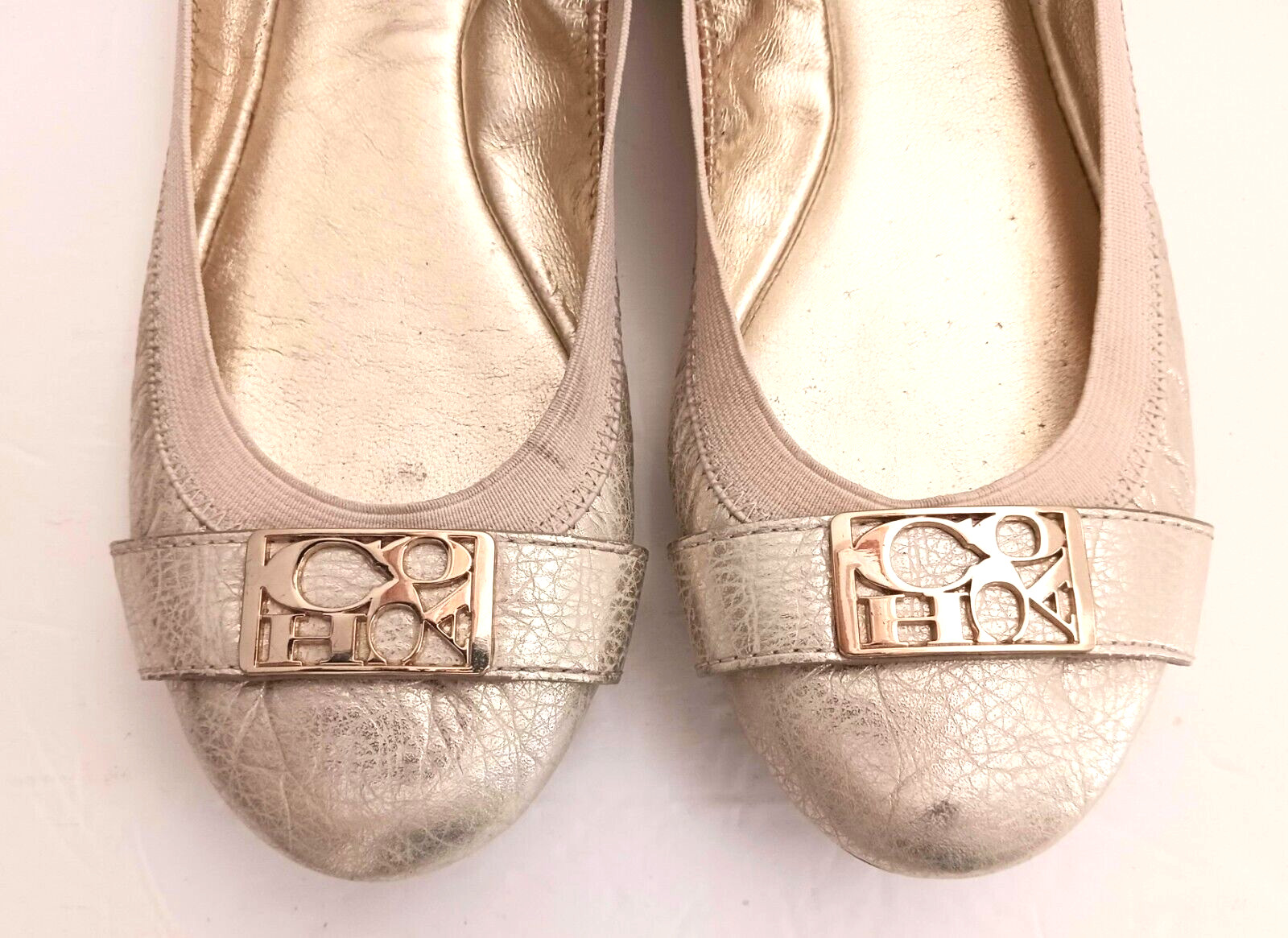 Coach Dora Ballet Flat Lt Gold Metallic Pebbled Leather Logo Elastic Edge Sz 8.5