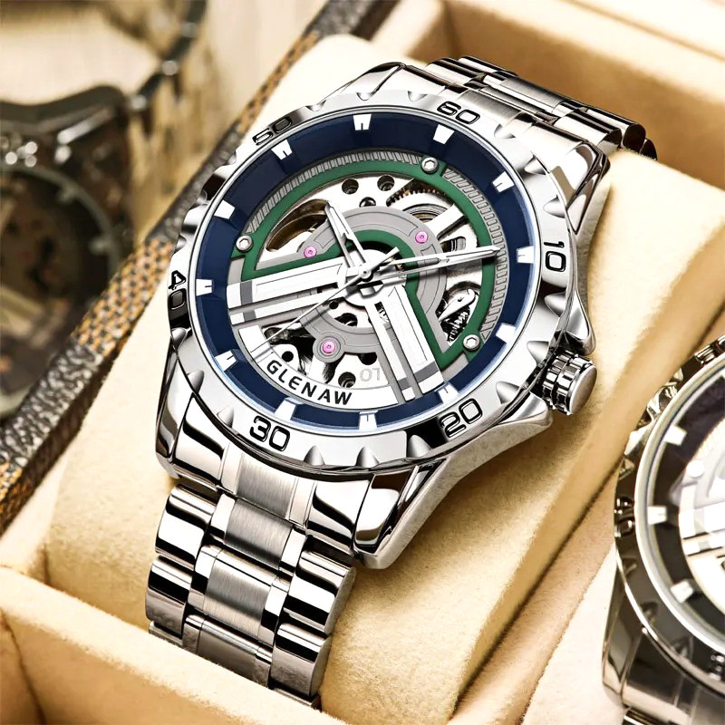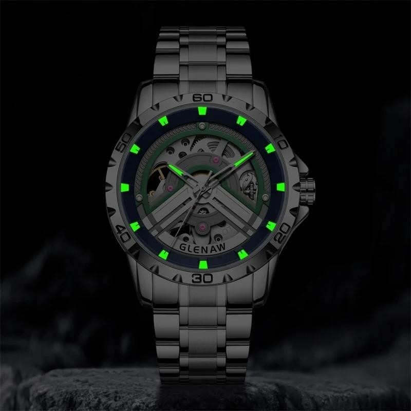43MM GLENAW Automatic Men Watch Luxury Skeleton Waterproof Stainless Steel NEW