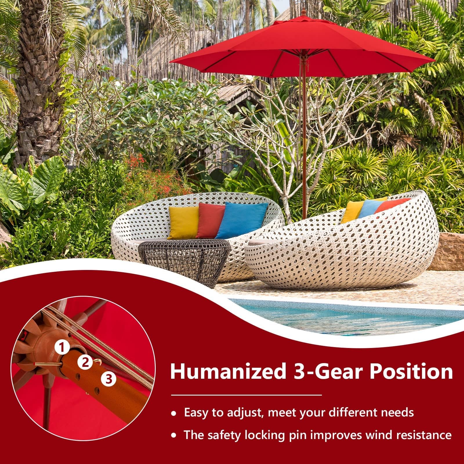 9.5FT Wooden Patio Umbrella with Rope Pulley Lift 8 Fiberglass Rib