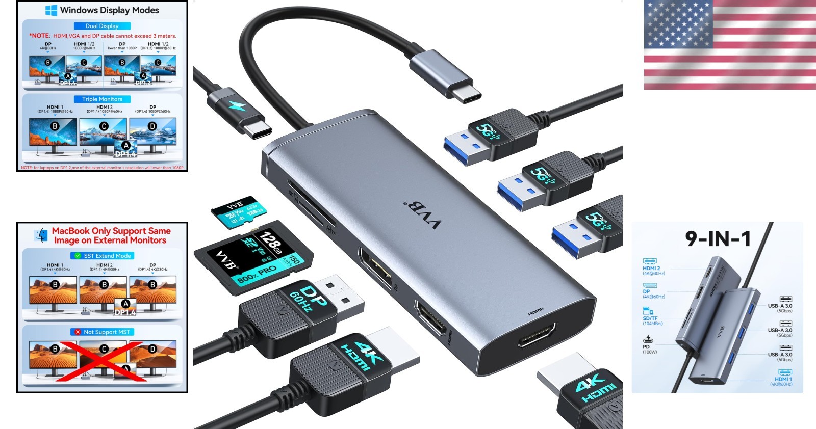 Особенности: Plug and Play, 100W PD, Triple Display, SD Card Reader, TF Card Reader