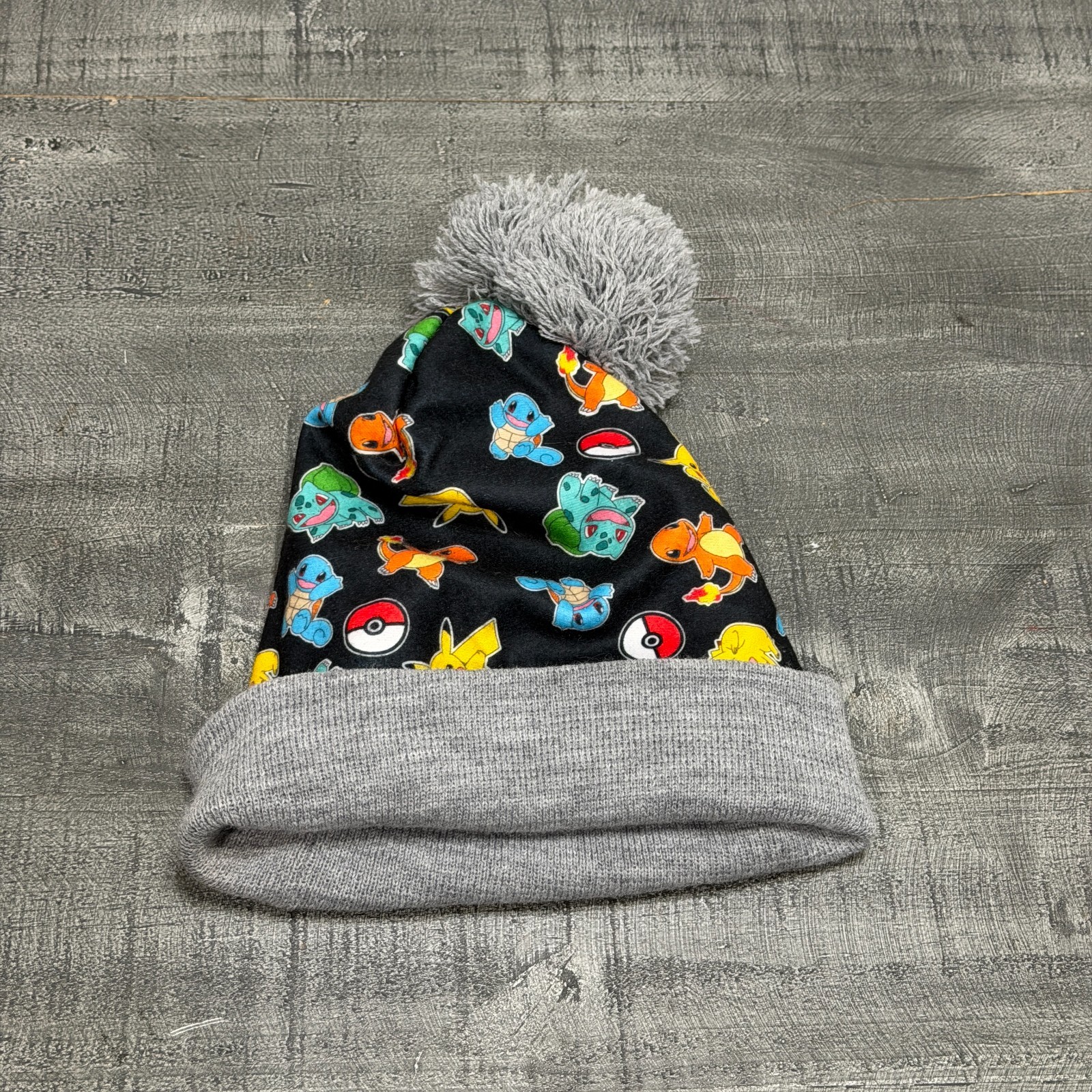 Pokemon Kids Youth Beanie Pikachu Charmander Squirtle Black Gray Fleece Pom OSFM