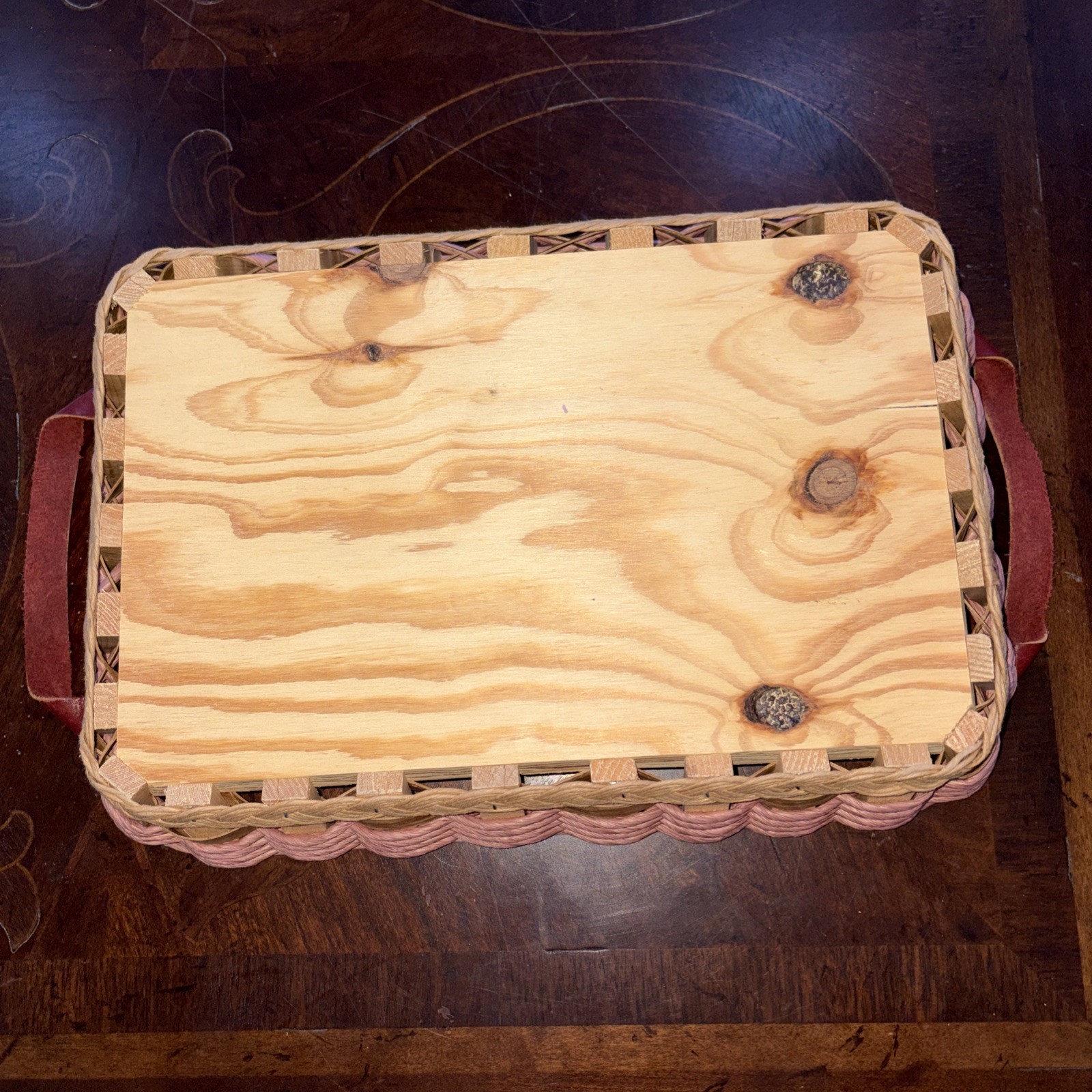 как выглядит Rustic Wicker Woven Tray Wooden Bottom with Leather Handles 16x11x3 фото