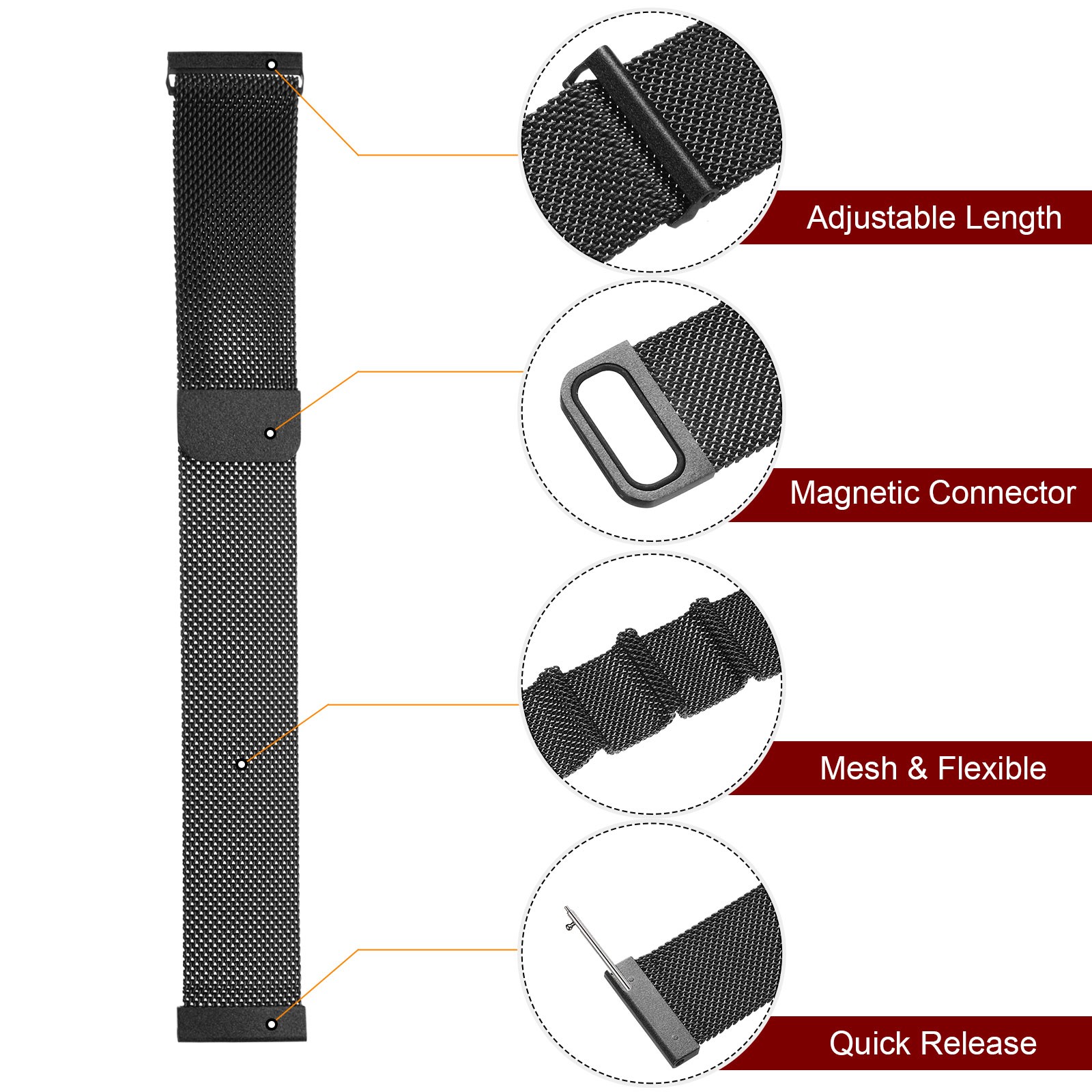 22mm Stainless Steel Mesh Watch Band with Magnetic Buckle, Black