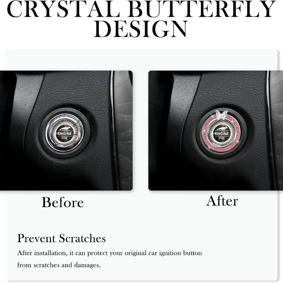 2PCS Bling Car Push Start Button Cover Decoration Ring, Shiny Push to Start Pink