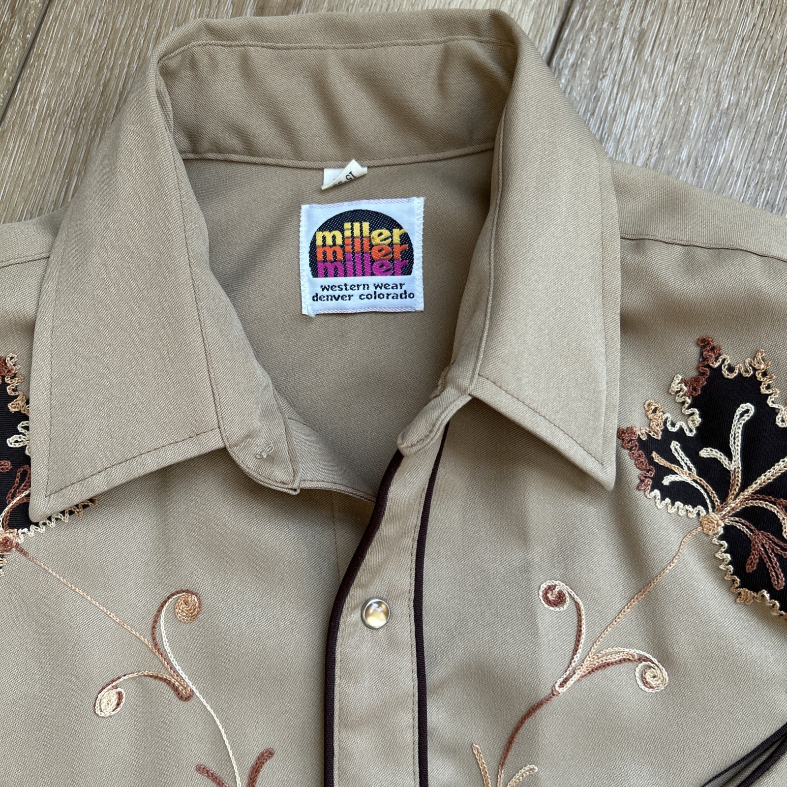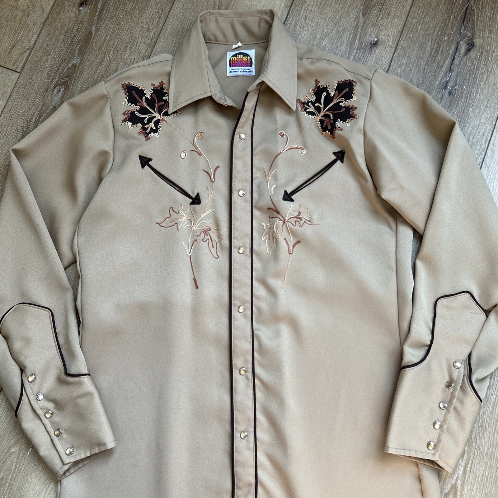 Vintage Miller Shirt Men 15-35 Pearl Snap-up Western Embroidery Brown Polyester