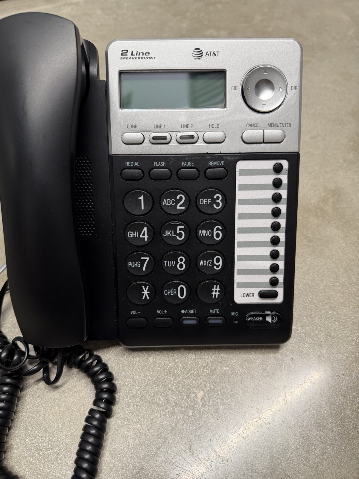 AT T 2 Line Corded Telephone Black Silver Speakerphone Headset Mute