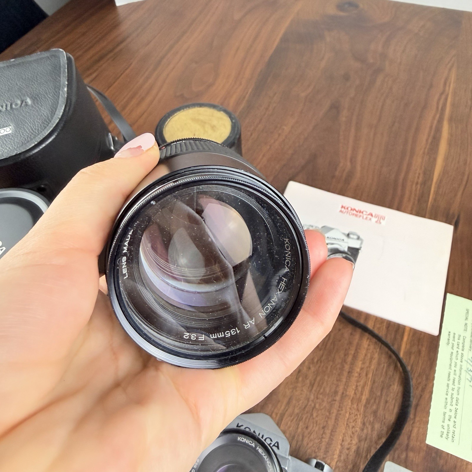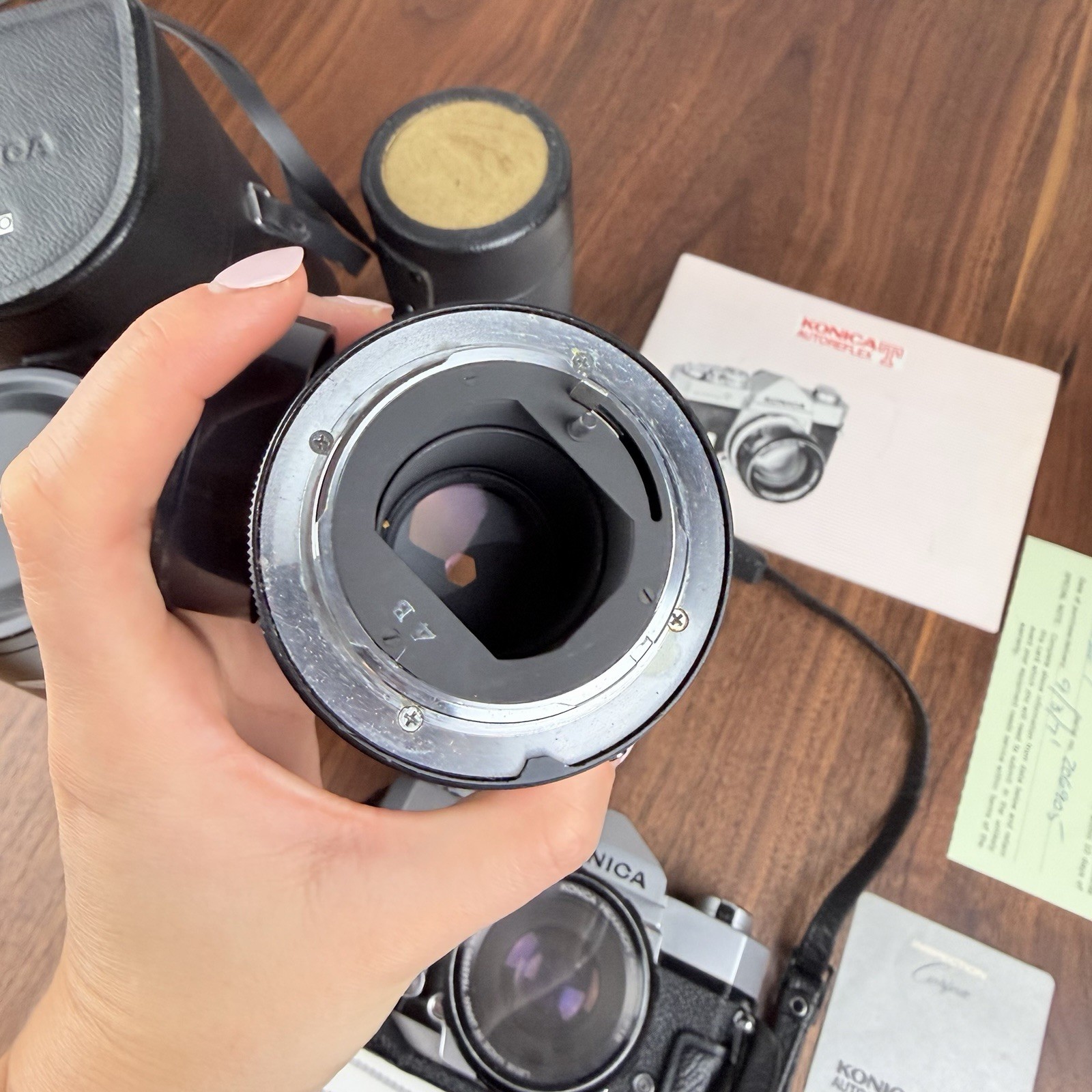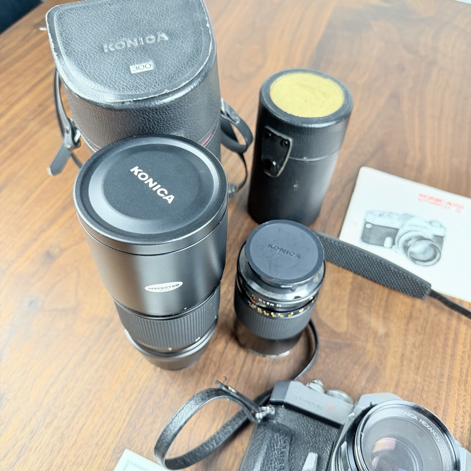 как выглядит KONICA AUTOREFLEX T Vintage Camera Set black W/ 3 Lenses Flash Paper Work READ фото