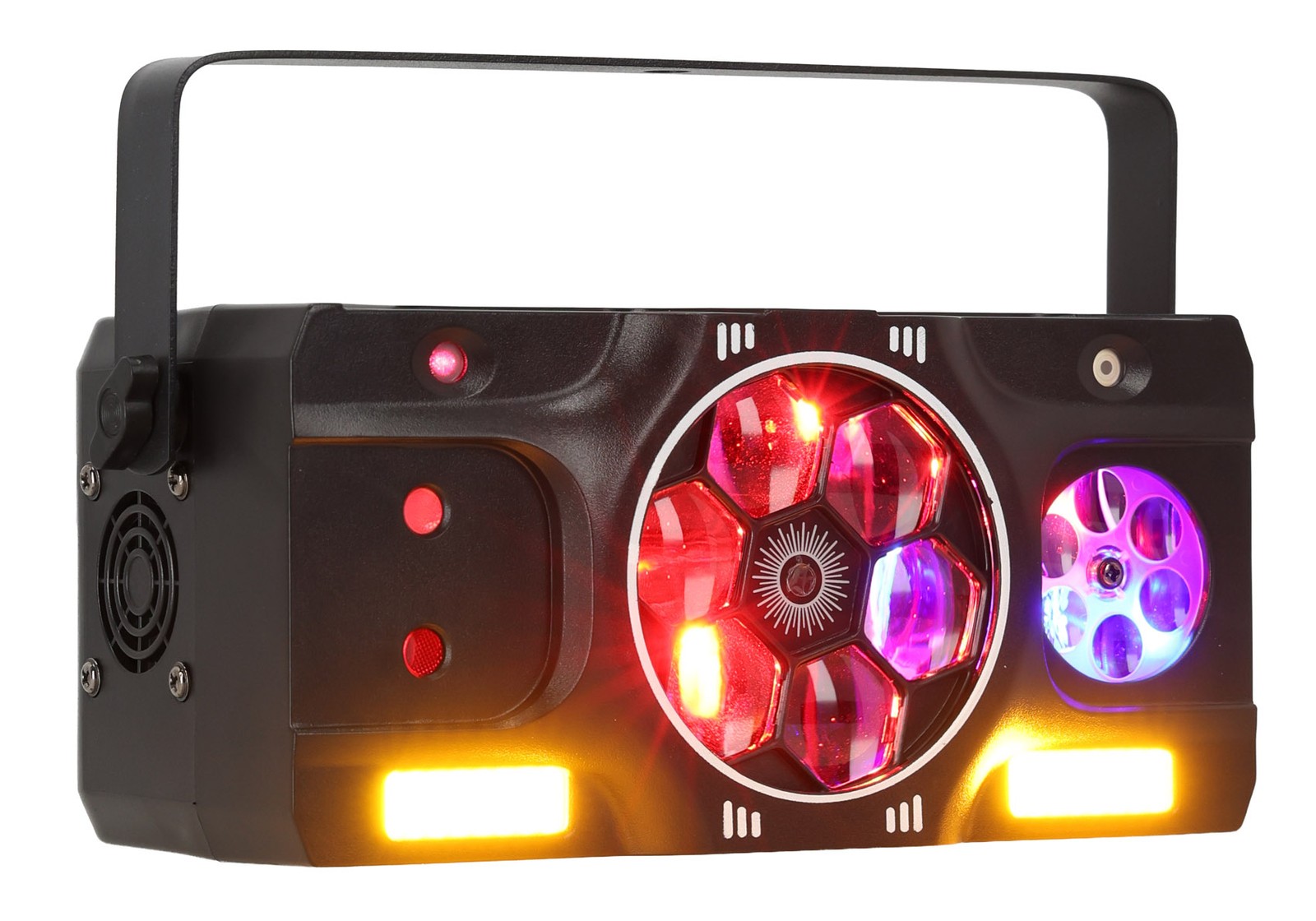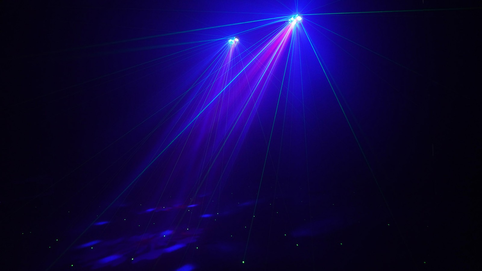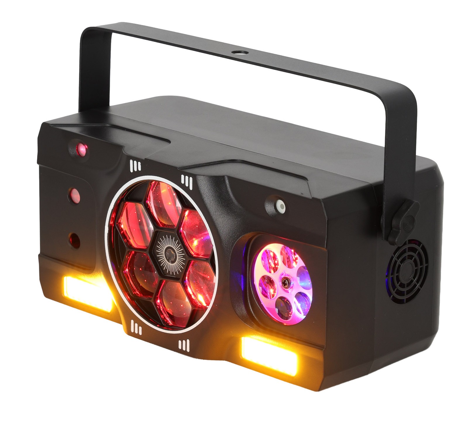 Lighting Effects: Gobo, Strobe, BEE EYE effect, dual red and green lasers, gypsophila laser
