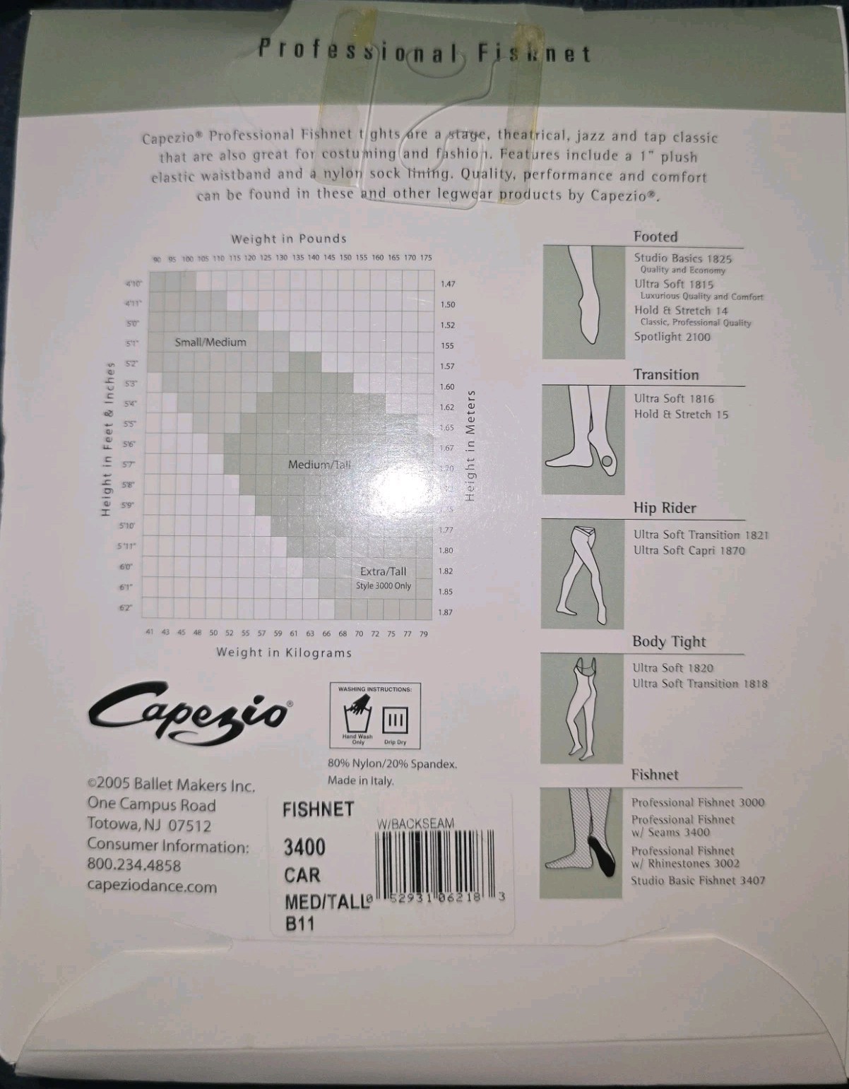 Capezio Professional Fishnet Tights W/ Backseam 3400 CAR Size M/T