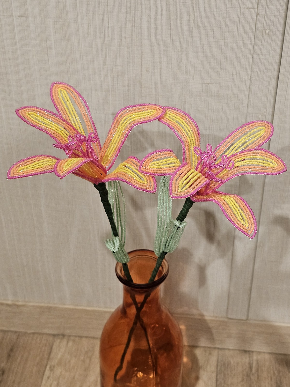 NEW 2 handmade French beaded TRI tone lilies lily flowers Orange Yellow Pink