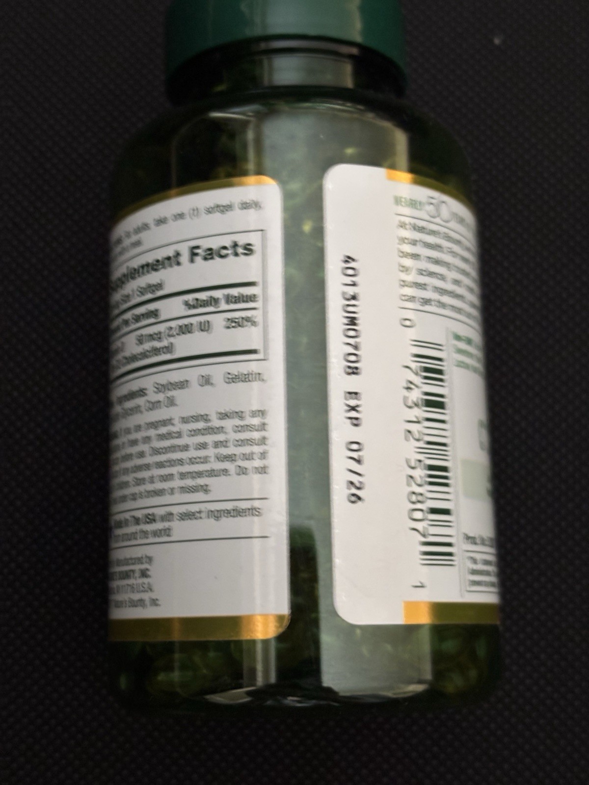 Ingredients: Vitamin D3 (Cholecalciferol), Soybean Oil, Gelatin, Vegetable Glycerin, Corn Oil