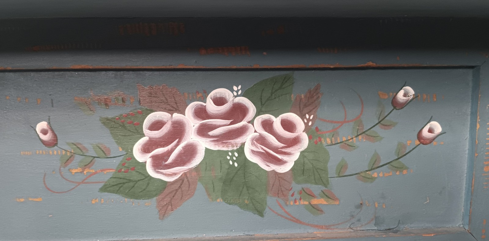 как выглядит Vtg Tole Painted Wood Shelf Blue Distressed Floral Folk Art Peg Rack Farmhouse фото