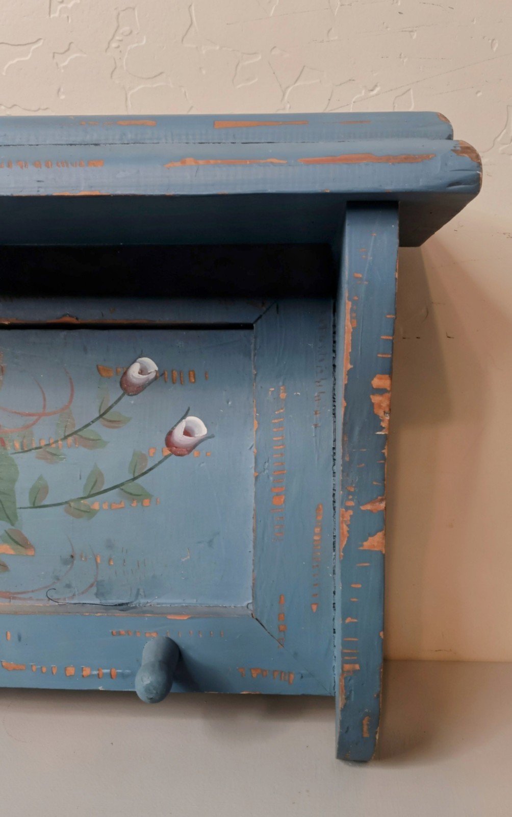 Vtg Tole Painted Wood Shelf Blue Distressed Floral Folk Art Peg Rack Farmhouse