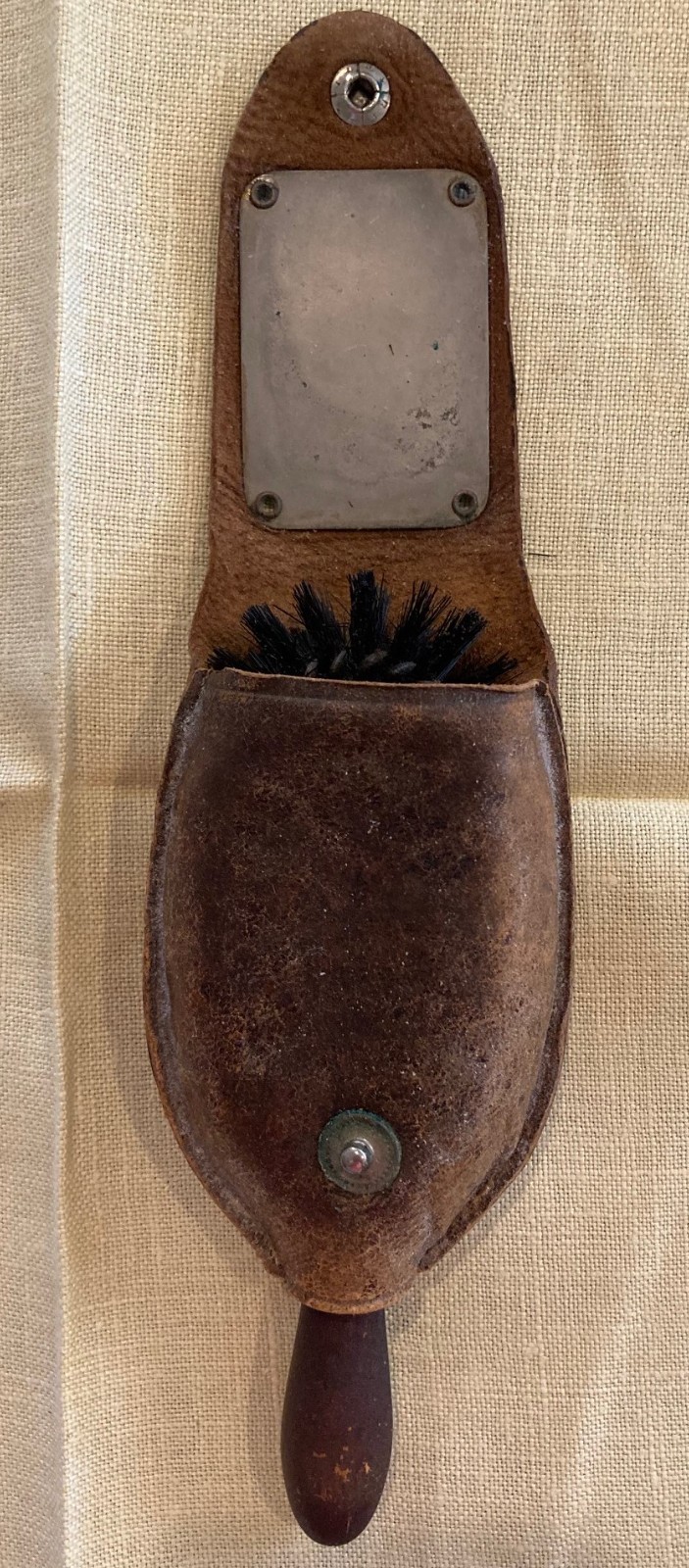 как выглядит Vintage Antique Oval Fuller Valet Brush with Wood Handle Leather Snap Cover фото