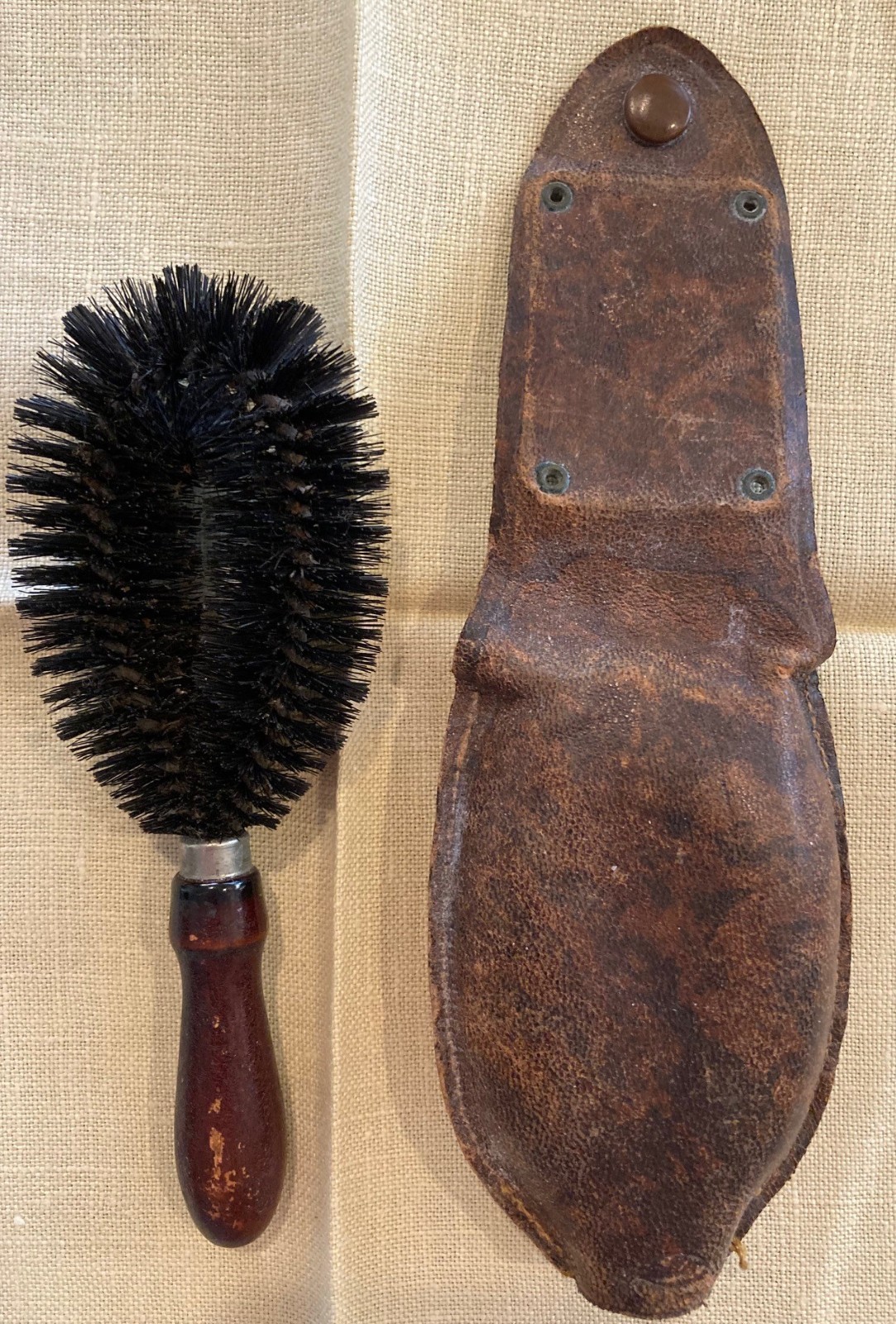 Vintage Antique Oval Fuller Valet Brush with Wood Handle Leather Snap Cover