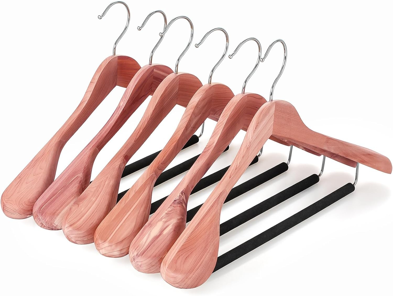 Luxury Cedar Wood Coat Hangers with Padded Pant Bar - 6 Pack