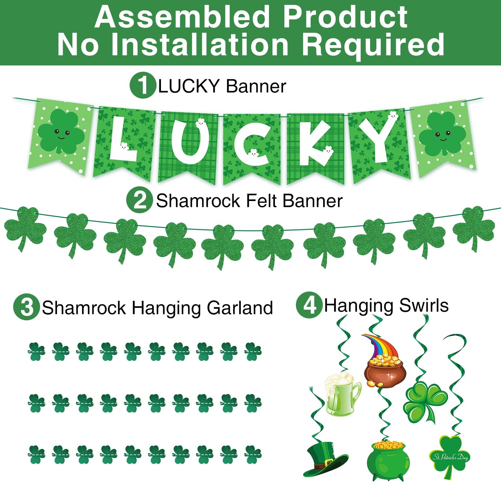 St Patricks Day Decorations, Pre-Assembled Lucky Banner with Shamrock Garland, C