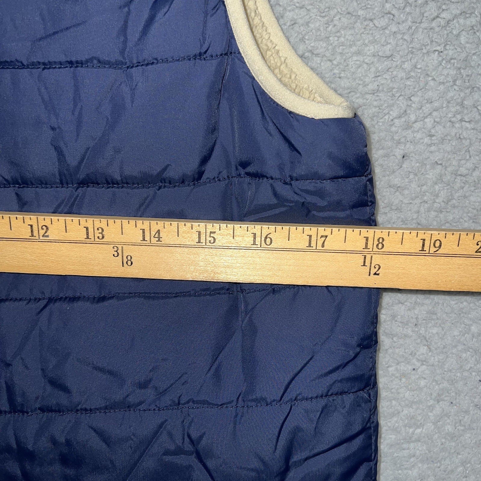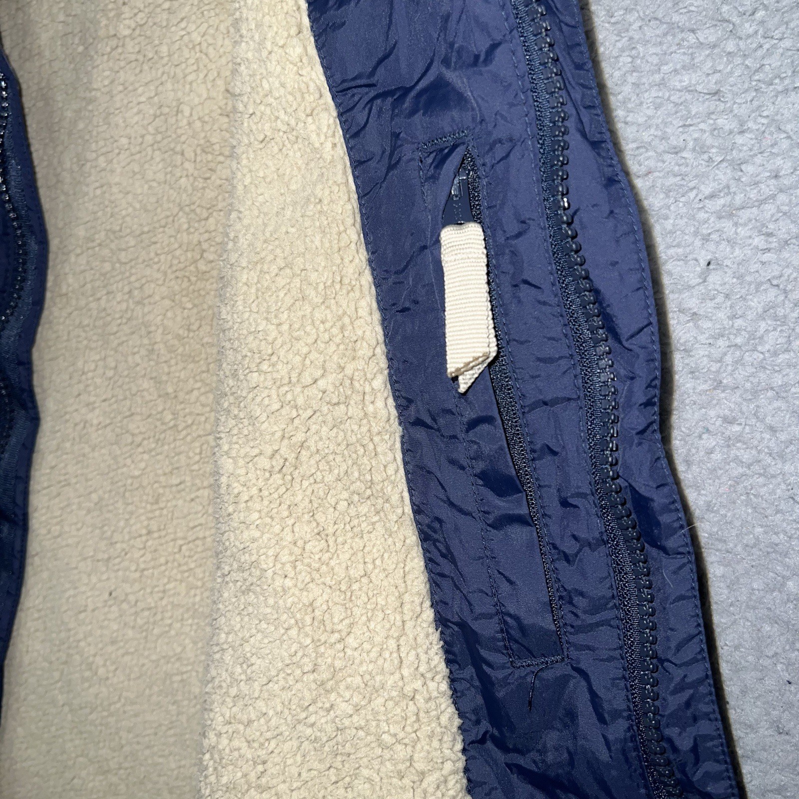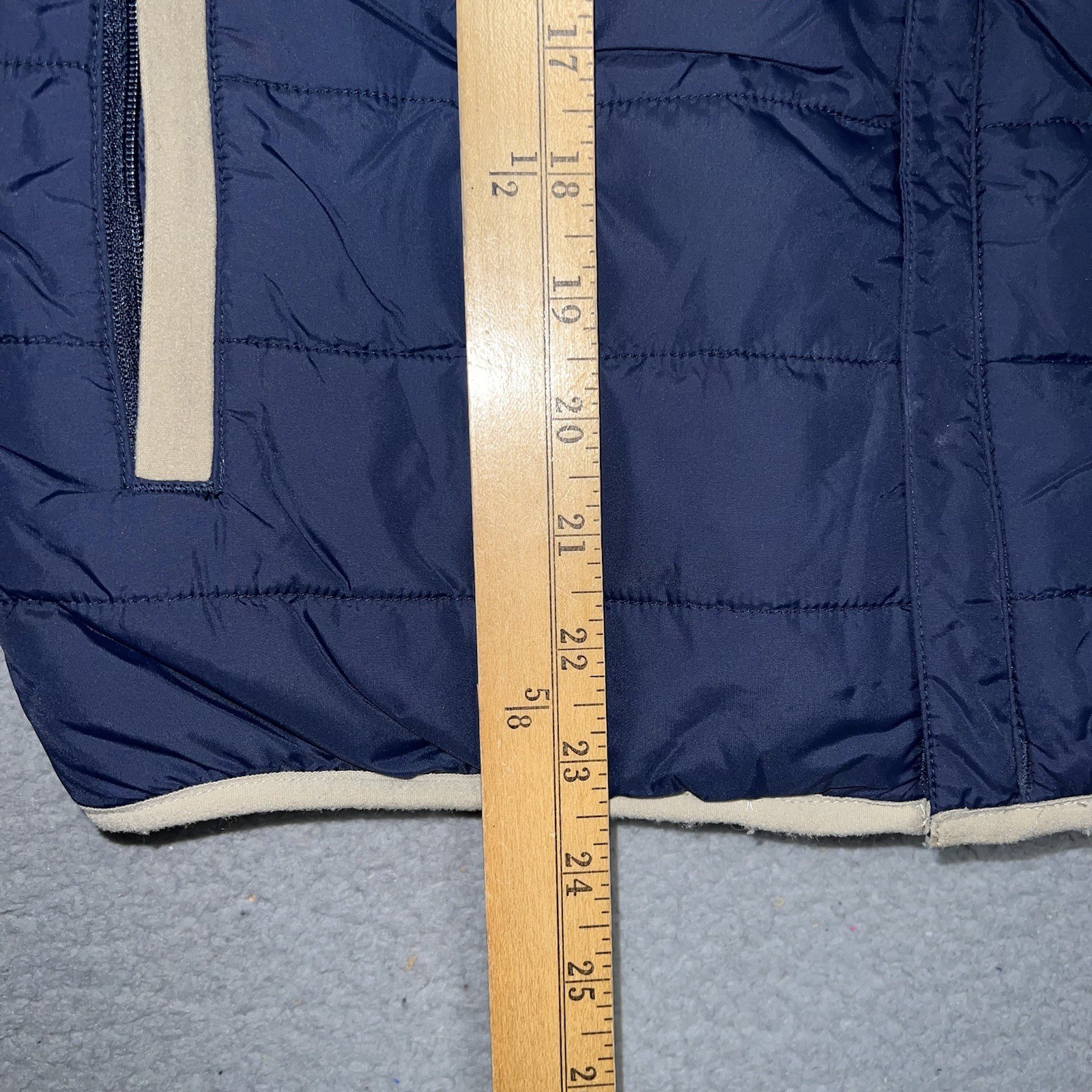 как выглядит Lands End Puffer Vest Youth Sz M 10-12 Navy Blue Tan Trim Sherpa Lined Pocket фото
