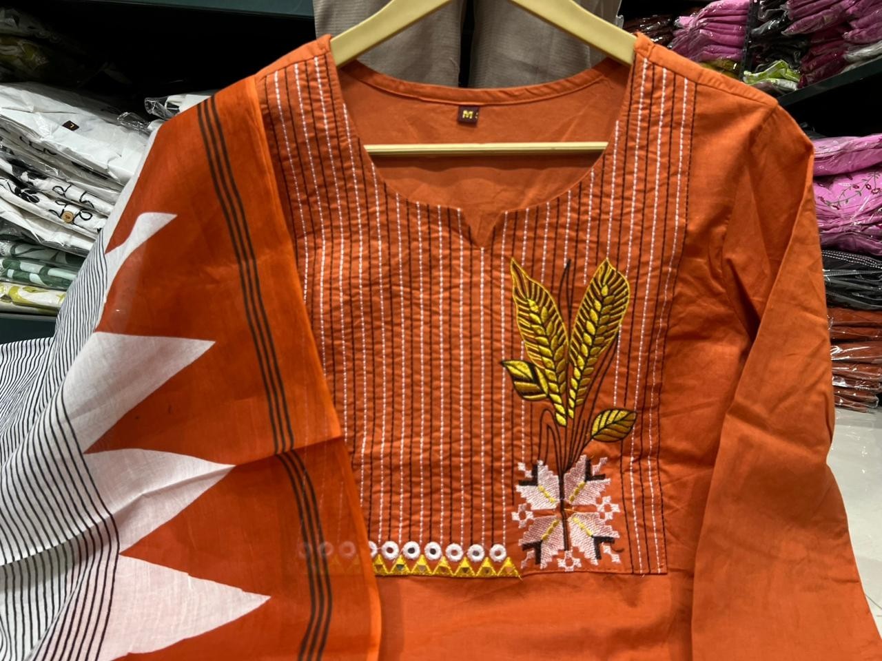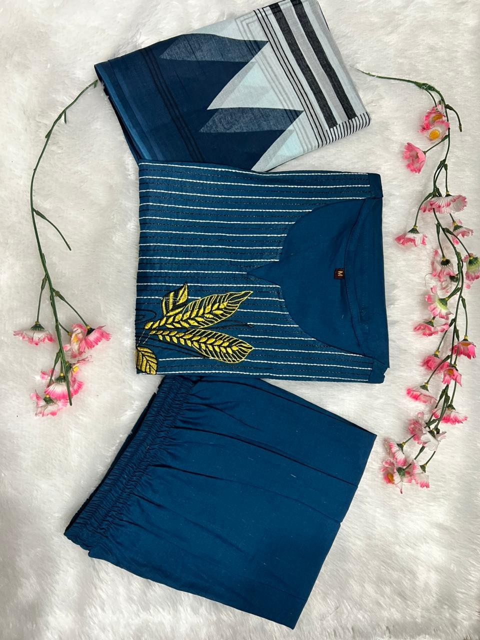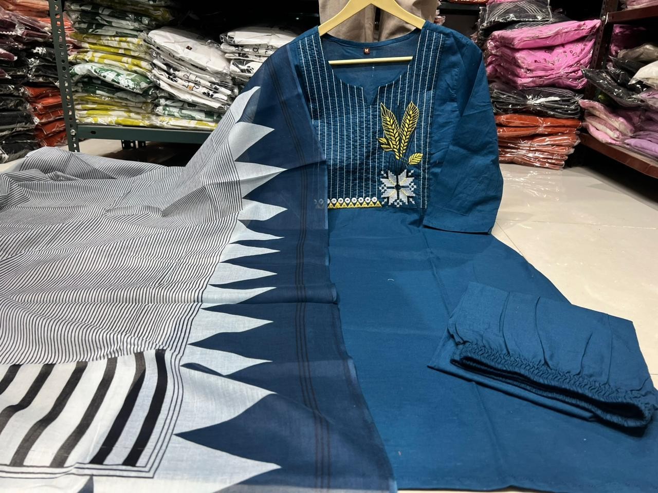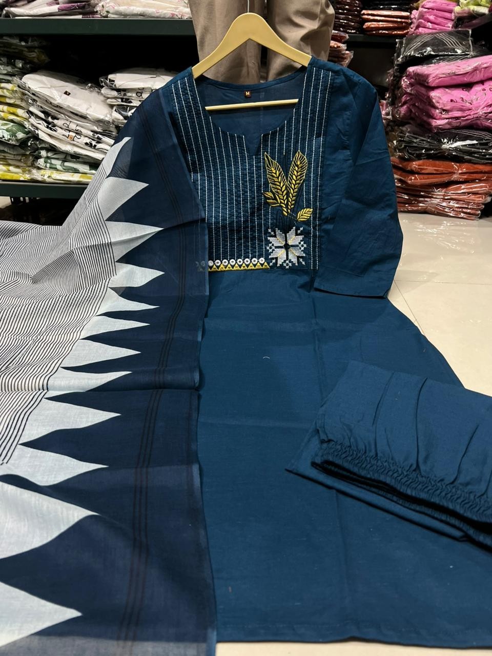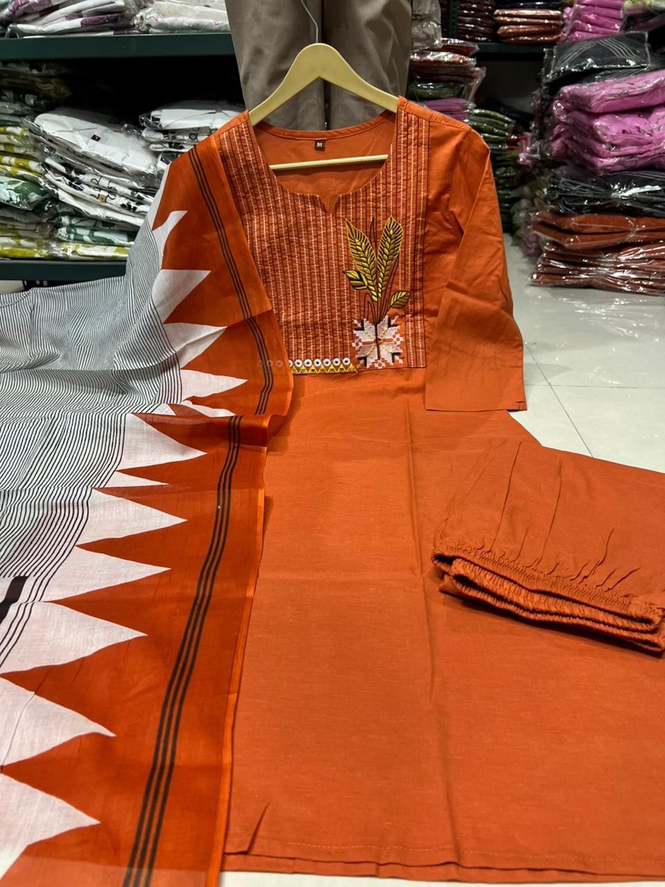 Women Cotton Kurta Pant Dupatta Set Embroidered Ethnic Suit Casual Festive Wear