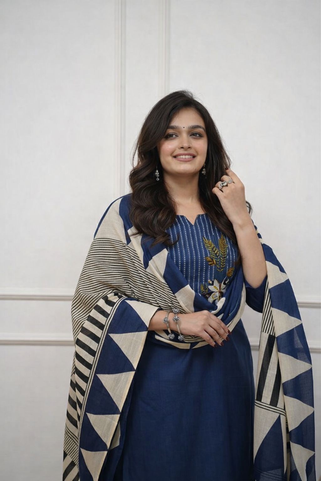 как выглядит Women Cotton Kurta Pant Dupatta Set Embroidered Ethnic Suit Casual Festive Wear фото
