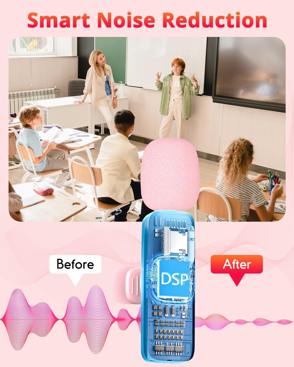 Pink Mini Wireless Microphone for iPhone Android, Lavalier Microphone with Noi
