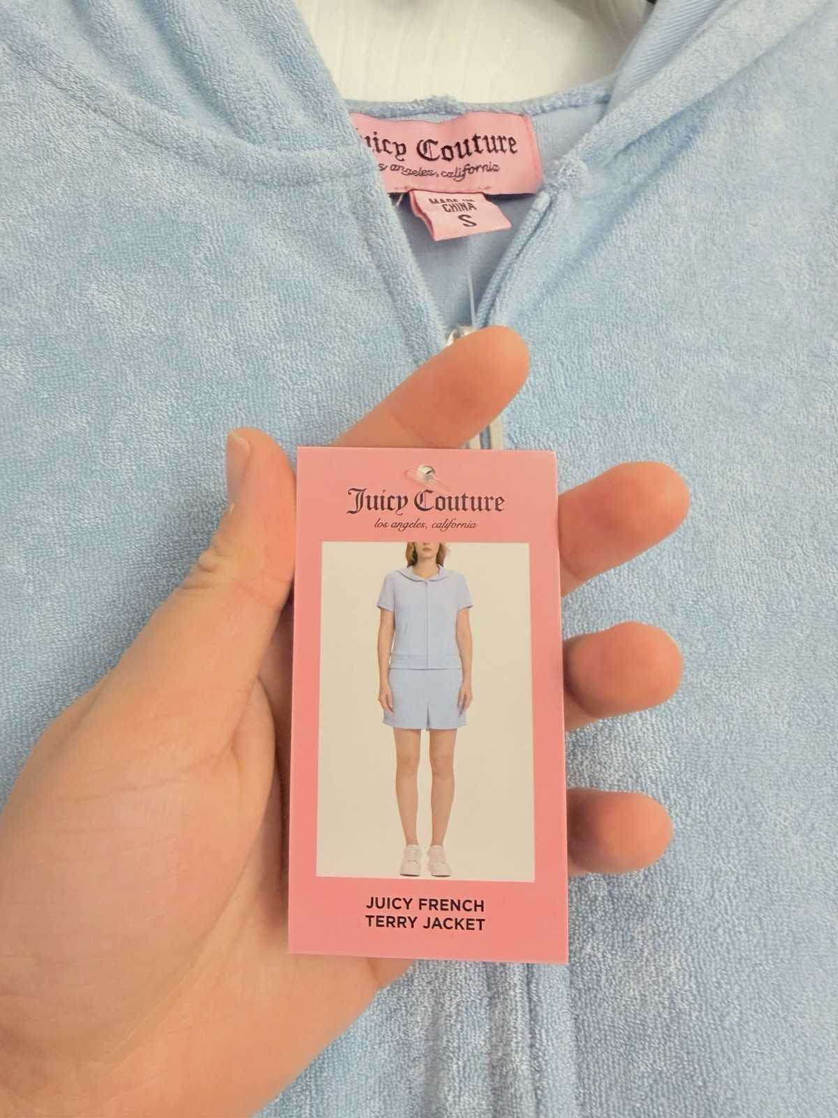 как выглядит Juicy Couture Light Blue Towel Terry Short Sleeve Hoodie and Shorts Set S фото
