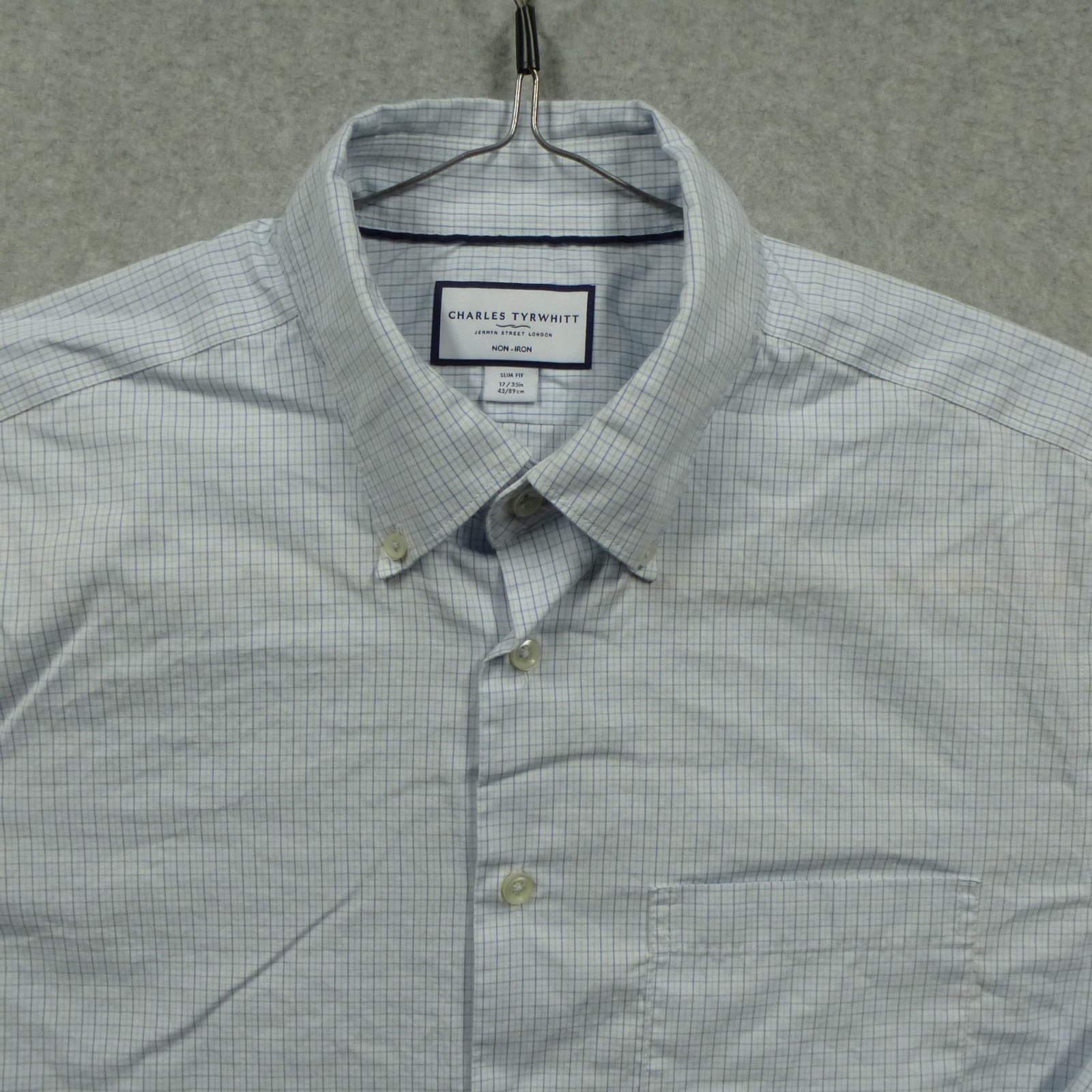 как выглядит Charles Tyrwhitt Shirt Mens 17 35 White Blue Graph Plaid Slim Fit Non Iron фото